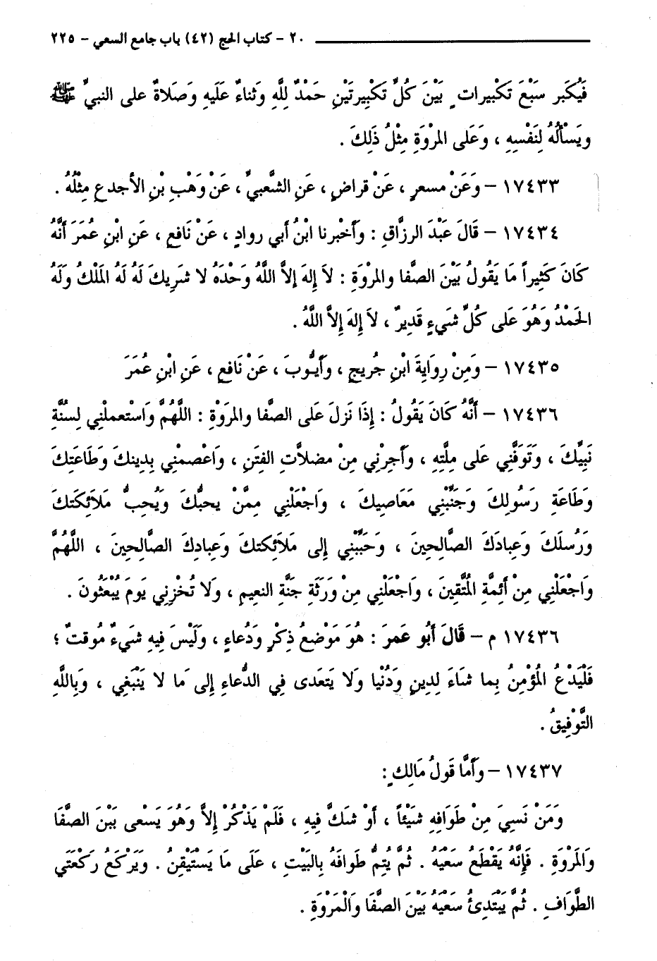 17434 - قَالَ عَبْدُ الرَّزَّاقِ: وَأَخْبَرَنَا ابْنُ أَبِي رَوَّادٍ، عَنْ نَافِعٍ، عَنِ ابْنِ عُمَرَ أَنَّهُ كَانَ كَثِيرًا مَا يَقُولُ بَيْنَ الصَّفَا وَالْمَرْوَةِ: لَا إِلَهَ إِلَّا اللَّهُ وَحْدَهُ لَا شَرِيكَ لَهُ، لَهُ الْمُلْكُ وَلَهُ الْحَمْدُ وَهُوَ عَلَى كُلِّ شَيْءٍ قَدِيرٌ، لَا إِلَهَ إِلَّا اللَّهُ.