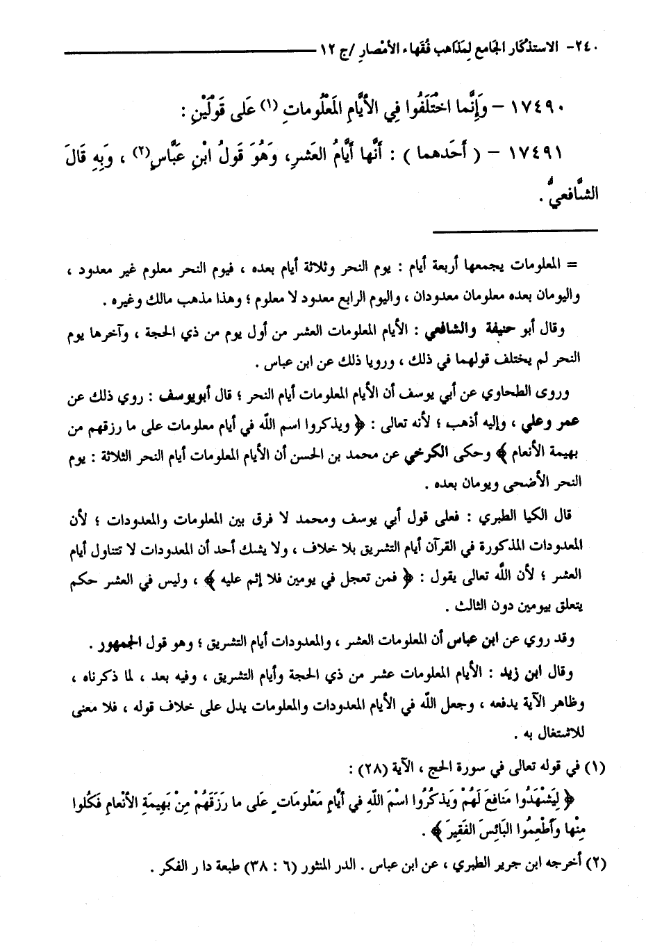 17490 - وَإِنَّمَا اخْتَلَفُوا فِي الْأَيَّامِ الْمَعْلُومَاتِ عَلَى قَوْلَيْنِ: 17491 - ( أَحَدُهُمَا ) أَنَّهَا أَيَّامُ الْعَشْرِ، وَهُوَ قَوْلُ ابْنِ عَبَّاسٍ، وَبِهِ قَالَ الشَّافِعِيُّ.
