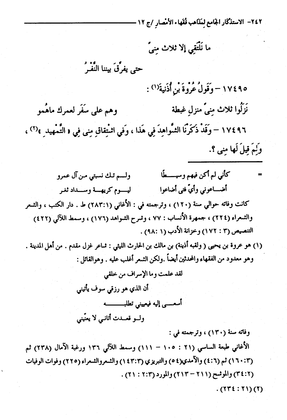 17496 - وَقَدْ ذَكَرْنَا الشَّوَاهِدَ فِي هَذَا، وَفِي اشْتِقَاقِ مِنًى فِي " التَّمْهِيدِ "، وَلِمَ قِيلَ لَهَا مِنًى ؟.