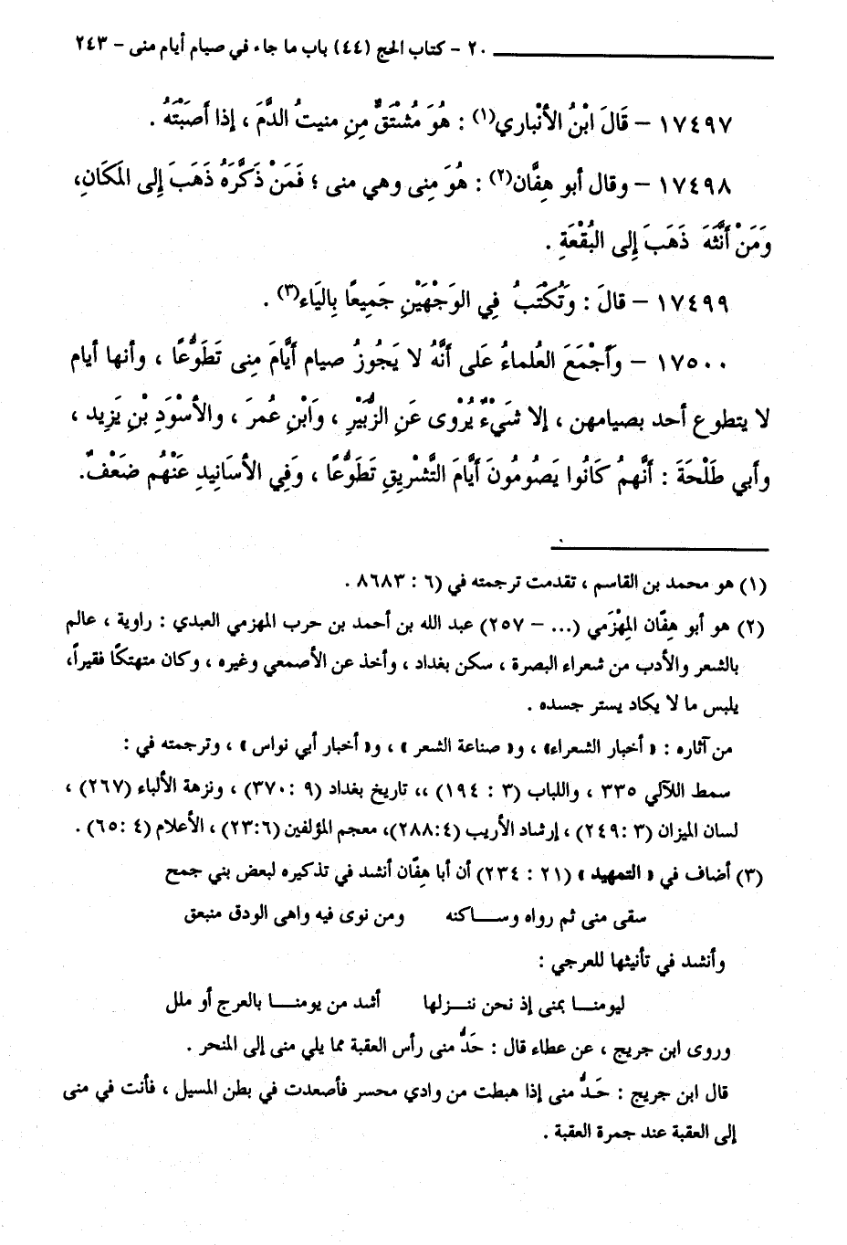 17500 - وَأَجْمَعَ الْعُلَمَاءُ عَلَى أَنَّهُ لَا يَجُوزُ صِيَامُ أَيَّامِ مِنًى تَطَوُّعًا، وَأَنَّهَا أَيَّامٌ لَا يَتَطَوَّعُ أَحَدٌ بِصِيَامِهِنَّ، إِلَّا شَيْءٌ يُرْوَى عَنِ الزُّبَيْرِ، وَابْنِ عُمَرَ، وَالْأَسْوَدِ بْنِ يَزِيدَ، وَأَبِي طَلْحَةَ: أَنَّهُمْ كَانُوا يَصُومُونَ أَيَّامَ التَّشْرِيقِ تَطَوُّعًا، وَفِي الْأَسَانِيدِ عَنْهُمْ ضَعْفٌ.