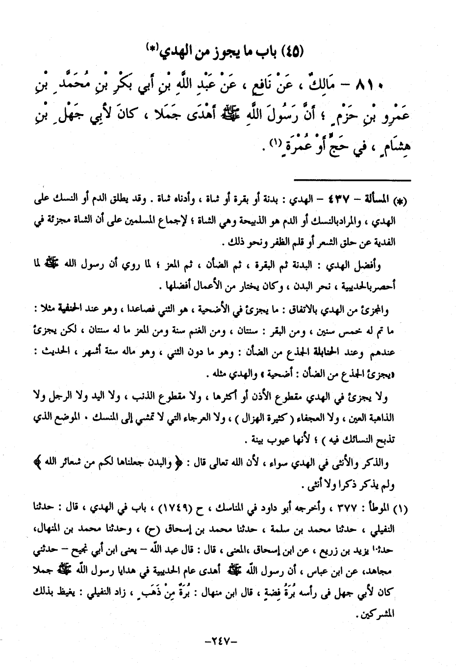 810 - مَالِكٌ، عَنْ نَافِعٍ، عَنْ عَبْدِ اللَّهِ بْنِ أَبِي بَكْرِ بْنِ مُحَمَّدِ بْنِ عَمْرِو بْنِ حَزْمٍ، أَنَّ رَسُولَ اللَّهِ - صَلَّى اللَّهُ عَلَيْهِ وَسَلَّمَ - أَهْدَى جَمَلًا، كَانَ لِأَبِي جَهْلِ بْنِ هِشَامٍ، فِي حَجٍّ أَوْ عُمْرَةٍ.