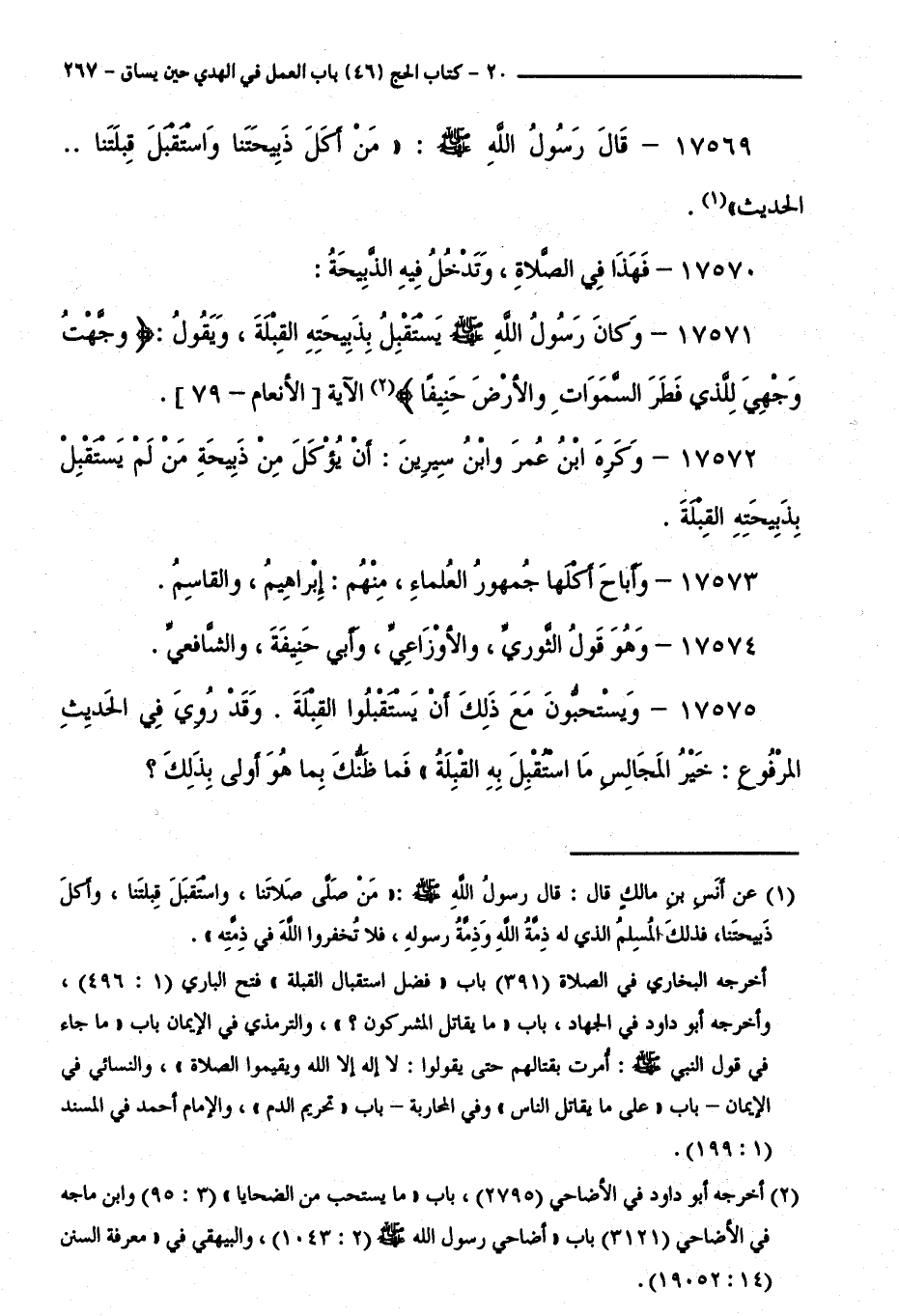 17571 - وَكَانَ رَسُولُ اللَّهِ - صَلَّى اللَّهُ عَلَيْهِ وَسَلَّمَ - يَسْتَقْبِلُ بِذَبِيحَتِهِ الْقِبْلَةَ، وَيَقُولُ:وَجَّهْتُ وَجْهِيَ لِلَّذِي فَطَرَ السَّمَاوَاتِ وَالْأَرْضَ حَنِيفًا الْآيَةَ [ الْأَنْعَامِ - 79 ].