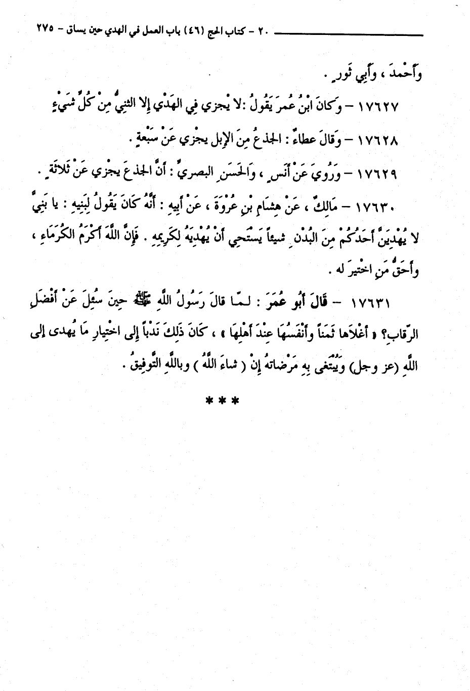 17630 - مَالِكٌ، عَنْ هِشَامِ بْنِ عُرْوَةَ، عَنْ أَبِيهِ: أَنَّهُ كَانَ يَقُولُ لِبَنِيهِ: يَا بَنِيَّ لَا يُهْدِيَنَّ أَحَدُكُمْ مِنَ الْبُدْنِ شَيْئًا يَسْتَحِي أَنَّهُ يُهْدِيهِ لِكَرِيمِهِ. فَإِنَّ اللَّهَ أَكْرَمُ الْكُرَمَاءِ، وَأَحَقُّ مَنِ اخْتِيرَ لَهُ.