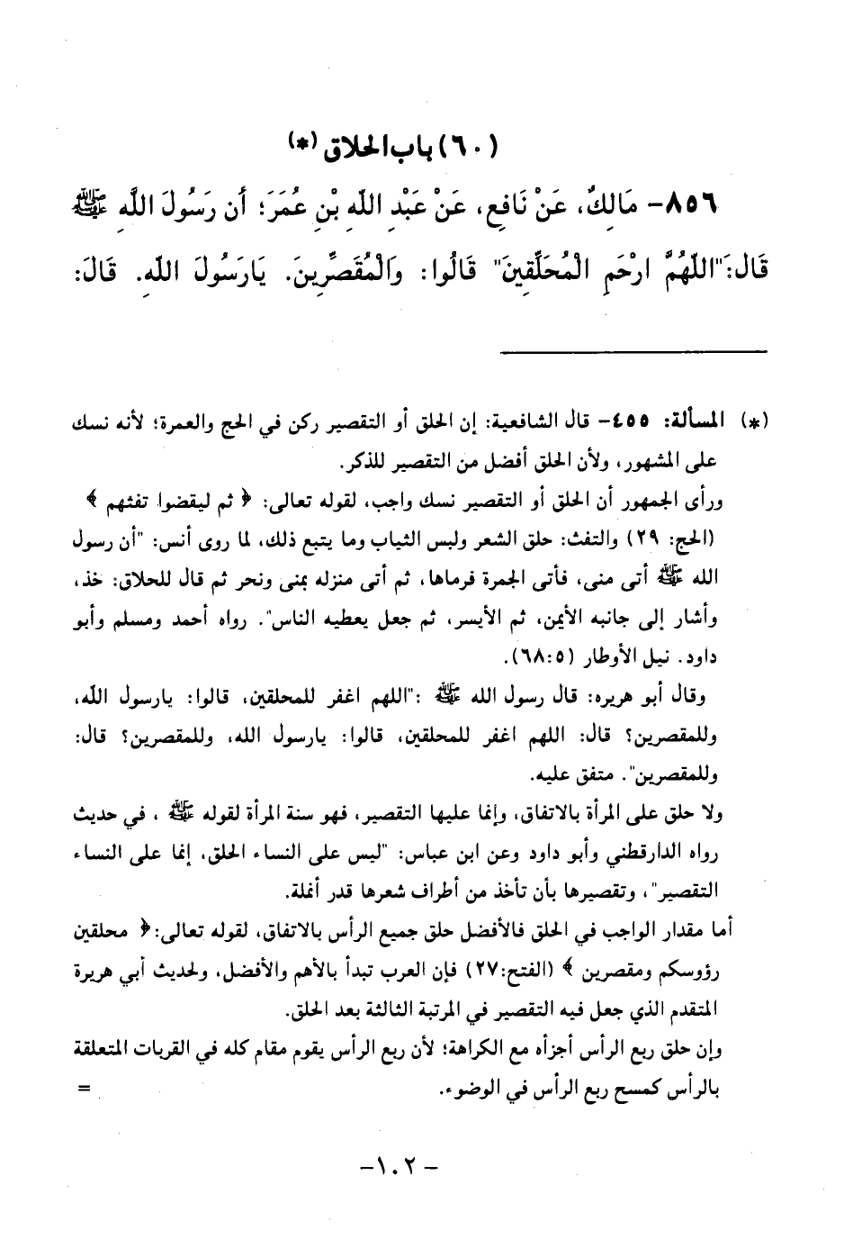 856 - مَالِكٌ، عَنْ نَافِعٍ، عَنْ عَبْدِ اللَّهِ بْنِ عُمَرَ أَنَّ رَسُولَ اللَّهِ - صَلَّى اللَّهُ عَلَيْهِ وَسَلَّمَ - قَالَ: " اللَّهُمَّ ارْحَمِ الْمُحَلِّقِينَ " قَالُوا: وَالْمُقَصِّرِينَ يَا رَسُولَ اللَّهِ قَالَ: