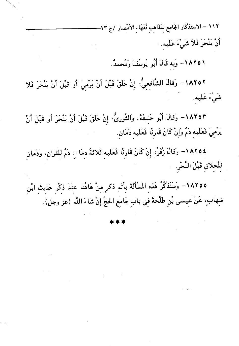 18254 - وَقَالَ زُفَرُ: إِنْ كَانَ قَارِنًا فَعَلَيْهِ ثَلَاثَةُ دِمَاءٍ: دَمٌ لِلْقِرَانِ، وَدَمَانِ لِلْحِلَاقِ قَبْلَ النَّحْرِ.