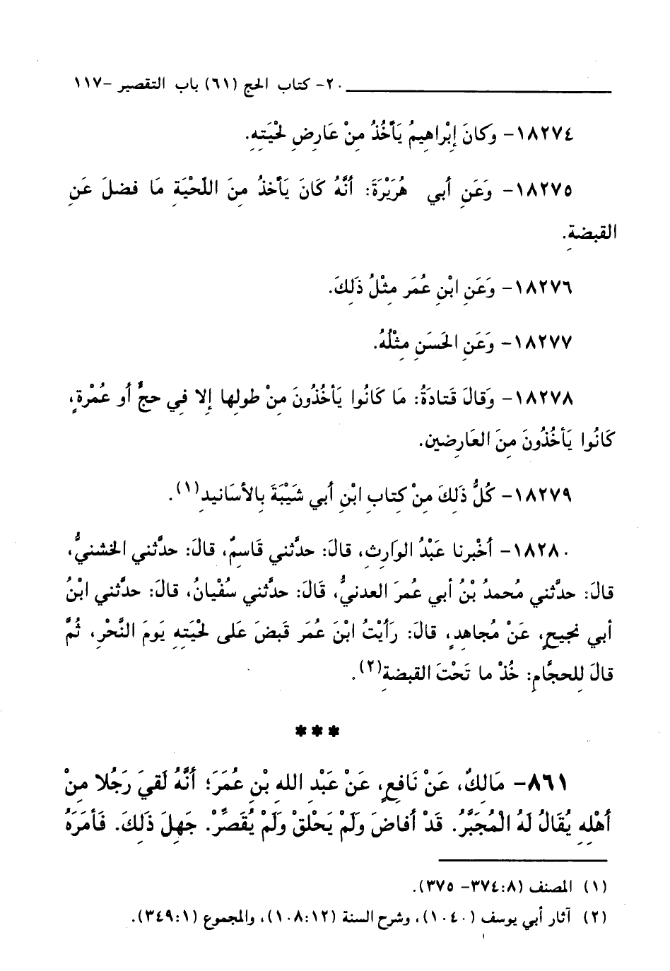 18280 - أَخْبَرَنَا عَبْدُ الْوَارِثِ قَالَ: حَدَّثَنِي قَاسِمٌ قَالَ: حَدَّثَنِي الْخُشَنِيُّ قَالَ: حَدَّثَنِي مُحَمَّدُ بْنُ أَبِي عُمَرَ الْعَدَنِيُّ قَالَ: حَدَّثَنِي سُفْيَانُ قَالَ: حَدَّثَنِي ابْنُ أَبِي نَجِيحٍ، عَنْ مُجَاهِدٍ قَالَ: رَأَيْتُ ابْنَ عُمَرَ قَبَضَ عَلَى لِحْيَتِهِ يَوْمَ النَّحْرِ، ثُمَّ قَالَ لِلْحَجَّامِ: خُذْ مَا تَحْتَ الْقَبْضَةِ.