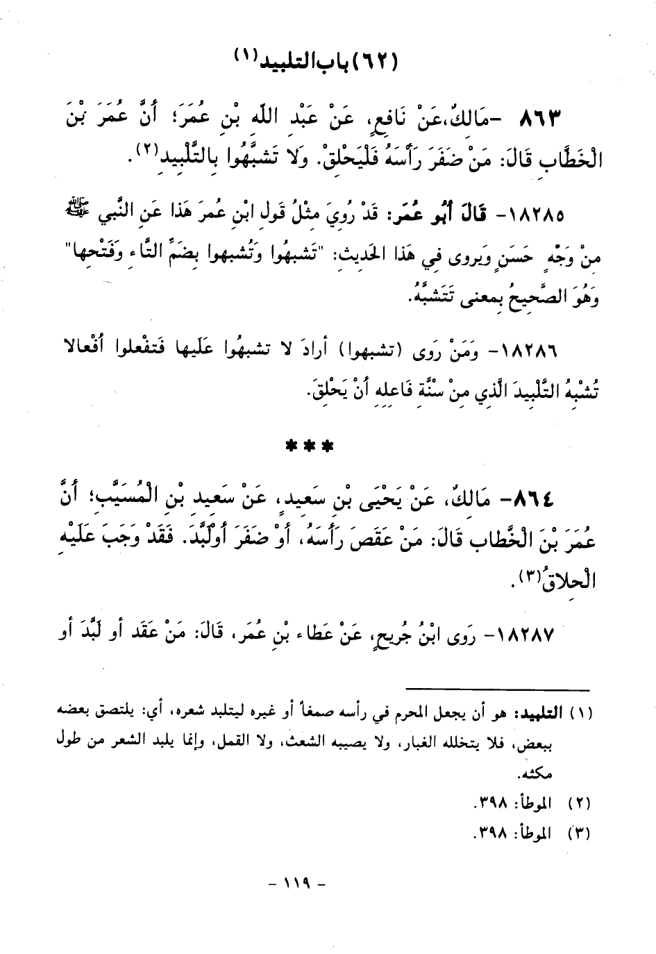 863 - مَالِكٌ، عَنْ نَافِعٍ، عَنْ عَبْدِ اللَّهِ بْنِ عُمَرَ أَنَّ عُمَرَ بْنَ الْخَطَّابِ قَالَ: مَنْ ضَفَّرَ رَأْسَهُ فَلْيَحْلِقْ. وَلَا تَشَبَّهُوا بِالتَّلْبِيدِ.