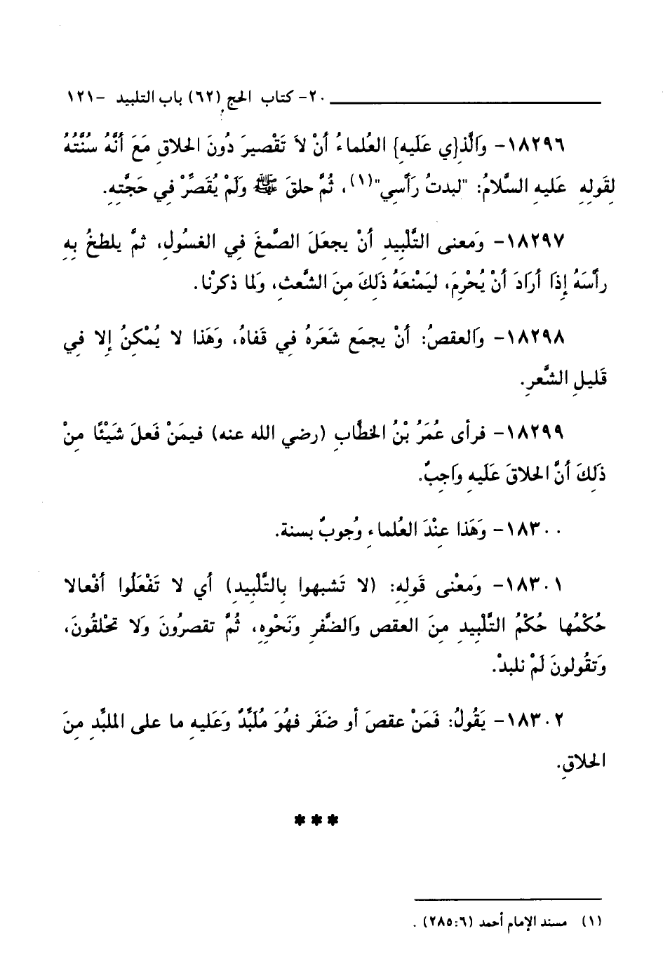 18299 - فَرَأَى عُمَرُ بْنُ الْخَطَّابِ ( رَضِيَ اللَّهُ عَنْهُ ) فِيمَنْ فَعَلَ شَيْئًا مِنْ ذَلِكَ أَنَّ الْحِلَاقَ عَلَيْهِ وَاجِبٌ.