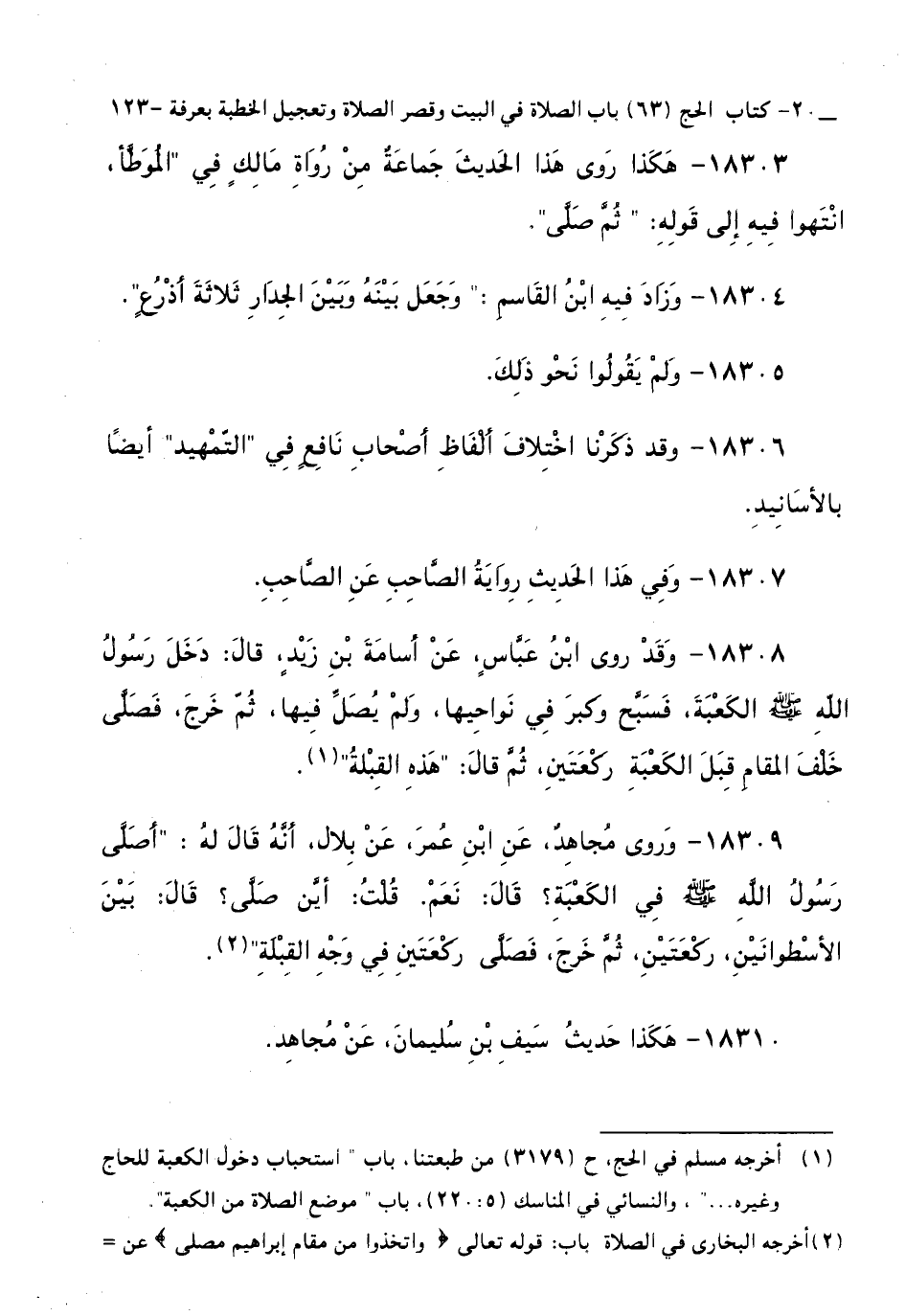 18309 - وَرَوَى مُجَاهِدٌ، عَنِ ابْنِ عُمَرَ، عَنْ بِلَالٍ، أَنَّهُ قَالَ لَهُ: " أَصَلَّى رَسُولُ اللَّهِ - صَلَّى اللَّهُ عَلَيْهِ وَسَلَّمَ - فِي الْكَعْبَةِ ؟ قَالَ: نَعَمْ. قُلْتُ: أَيْنَ صَلَّى ؟ قَالَ: بَيْنَ الْأُسْطُوَانَيْنِ، رَكْعَتَيْنِ، ثُمَّ خَرَجَ، فَصَلَّى رَكْعَتَيْنِ فِي وَجْهِ الْقِبْلَةِ ".