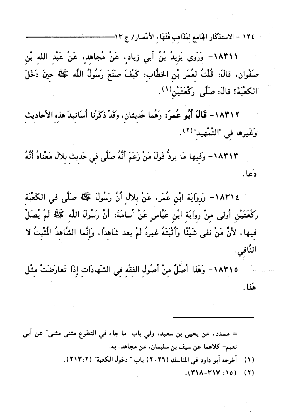 18314 - وَرِوَايَةُ ابْنِ عُمَرَ، عَنْ بِلَالٍ أَنَّ رَسُولَ اللَّهِ - صَلَّى اللَّهُ عَلَيْهِ وَسَلَّمَ - صَلَّى فِي الْكَعْبَةِ رَكْعَتَيْنِ أَوْلَى مِنْ رِوَايَةِ ابْنِ عَبَّاسٍ عَنْ أُسَامَةَ: أَنَّ رَسُولَ اللَّهِ - صَلَّى اللَّهُ عَلَيْهِ وَسَلَّمَ - لَمْ يُصَلِّ فِيهَا ؛ لِأَنَّ مَنْ نَفَى شَيْئًا وَأَثْبَتَهُ غَيْرُهُ لَمْ يَعُدْ شَاهِدًا، وَإِنَّمَا الشَّاهِدُ الْمُثْبِتُ لَا النَّافِي.