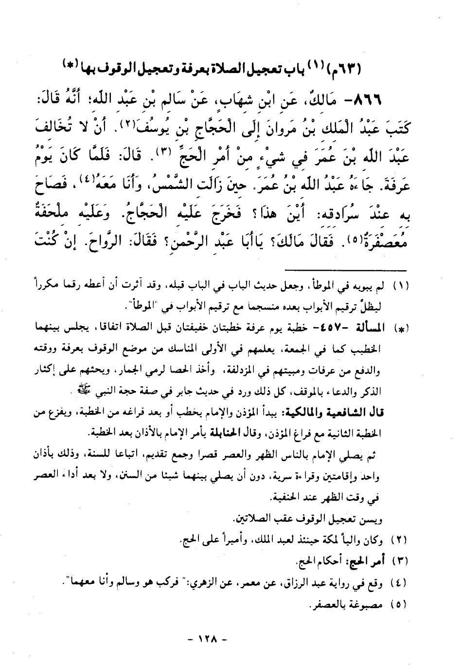 866 - مَالِكٌ، عَنِ ابْنِ شِهَابٍ، عَنْ سَالِمِ بْنِ عَبْدِ اللَّهِ أَنَّهُ قَالَ: كَتَبَ عَبْدُ الْمَلِكِ بْنُ مَرْوَانَ إِلَى الْحَجَّاجِ بْنِ يُوسُفَ. أَنْ لَا تُخَالِفْ عَبْدَ اللَّهِ بْنَ عُمَرَ فِي شَيْءٍ مِنْ أَمْرِ الْحَجِّ قَالَ: فَلَمَّا كَانَ يَوْمُ عَرَفَةَ جَاءَهُ عَبْدُ اللَّهِ بْنُ عُمَرَ حِينَ زَالَتِ الشَّمْسُ، وَأَنَا مَعَهُ، فَصَاحَ بِهِ عِنْدَ سُرَادِقِهِ: أَيْنَ هَذَا ؟ فَخَرَجَ عَلَيْهِ الْحَجَّاجُ وَعَلَيْهِ مِلْحَفَةٌ مُعَصْفَرَةٌ فَقَالَ مَا لِكَ يَا أَبَا عَبْدِ الرَّحْمَنِ ؟ فَقَالَ: الرَّوَاحَ إِنْ كُنْتَ