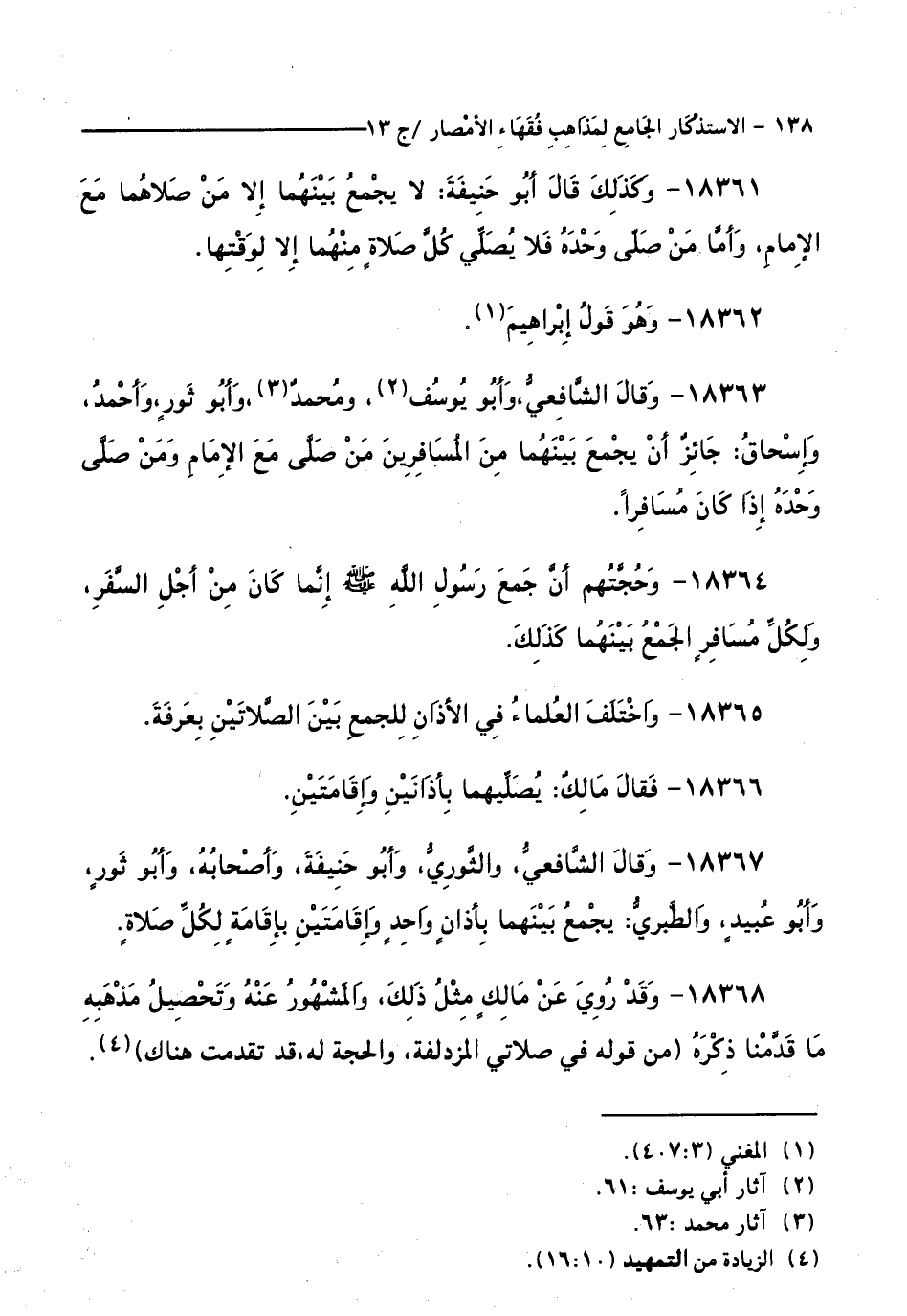 18361 - وَكَذَلِكَ قَالَ أَبُو حَنِيفَةَ: لَا يَجْمَعُ بَيْنَهُمَا إِلَّا مَنْ صَلَّاهُمَا مَعَ الْإِمَامِ، وَأَمَّا مَنْ صَلَّى وَحْدَهُ فَلَا يُصَلِّي كُلَّ صَلَاةٍ مِنْهُمَا إِلَّا لِوَقْتِهَا.