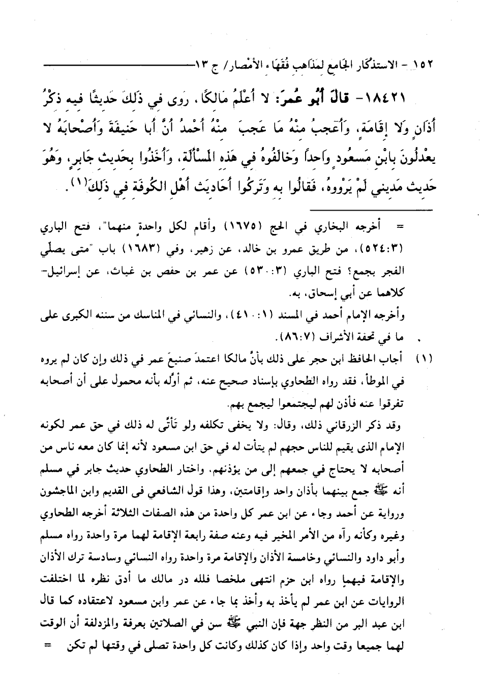18421 - قَالَ أَبُو عُمَرَ: لَا أَعْلَمُ مَالِكًا رَوَى فِي ذَلِكَ حَدِيثًا فِيهِ ذِكْرُ أَذَانٍ وَلَا إِقَامَةٍ، وَأَعْجَبُ مِنْهُ مَا عَجِبَ مِنْهُ أَحْمَدُ أَنَّ أَبَا حَنِيفَةَ وَأَصْحَابَهُ لَا يَعْدِلُونَ بِابْنِ مَسْعُودٍ وَاحِدًا وَخَالَفُوهُ فِي هَذِهِ الْمَسْأَلَةِ، وَأَخَذُوا بِحَدِيثِ جَابِرٍ، وَهُوَ حَدِيثٌ مَدِينِيٌّ لَمْ يَرْوُوهُ، فَقَالُوا بِهِ وَتَرَكُوا أَحَادِيثَ أَهْلِ الْكُوفَةِ فِي ذَلِكَ.