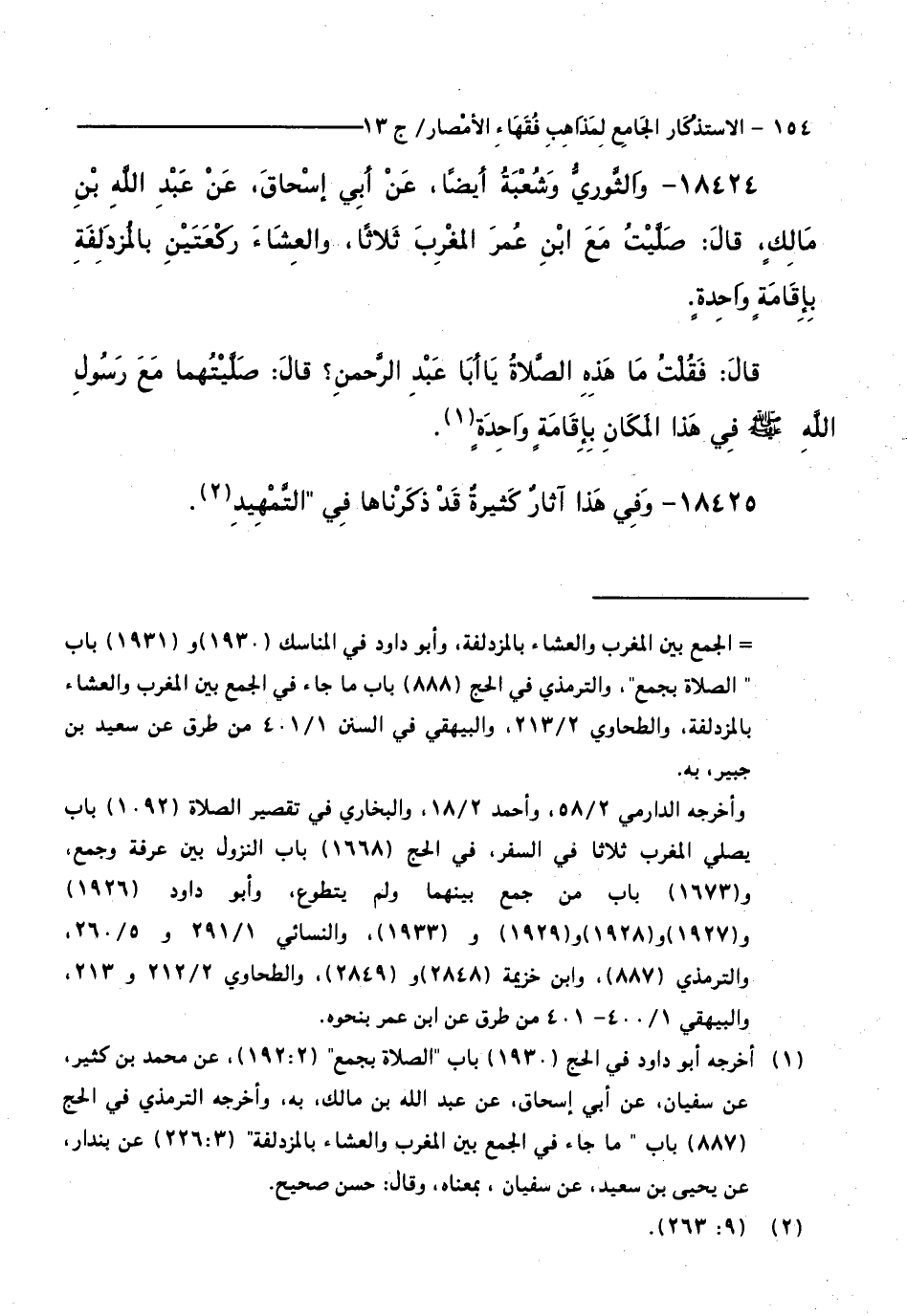 18424 - وَالثَّوْرِيُّ وَشُعْبَةُ أَيْضًا، عَنْ أَبِي إِسْحَاقَ، عَنْ عَبْدِ اللَّهِ بْنِ مَالِكٍ قَالَ: صَلَّيْتُ مَعَ ابْنِ عُمَرَ الْمَغْرِبَ ثَلَاثًا، وَالْعِشَاءَ رَكْعَتَيْنِ بِالْمُزْدَلِفَةِ بِإِقَامَةٍ وَاحِدَةٍ. قَالَ: فَقُلْتُ مَا هَذِهِ الصَّلَاةُ يَا أَبَا عَبْدِ الرَّحْمَنِ ؟ قَالَ: صَلَّيْتُهُمَا مَعَ رَسُولِ اللَّهِ - صَلَّى اللَّهُ عَلَيْهِ وَسَلَّمَ - فِي هَذَا الْمَكَانِ بِإِقَامَةٍ وَاحِدَةٍ.
