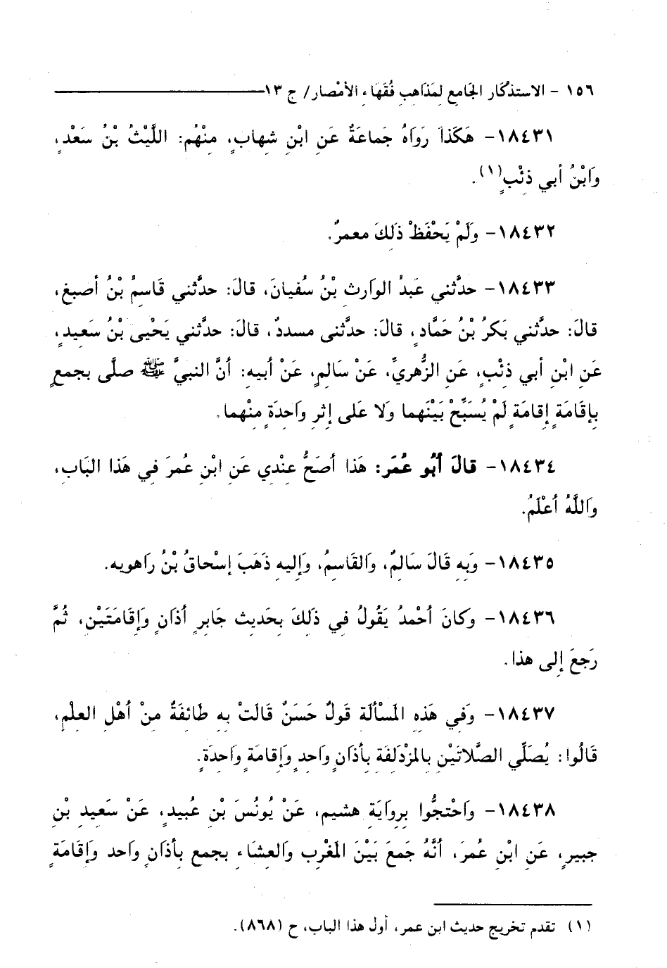 18433 - حَدَّثَنِي عَبْدُ الْوَارِثِ بْنُ سُفْيَانَ: قَالَ: حَدَّثَنِي قَاسِمُ بْنُ أَصْبَغَ قَالَ: حَدَّثَنِي بَكْرُ بْنُ حَمَّادٍ قَالَ: حَدَّثَنِي يَحْيَى بْنُ سَعِيدٍ عَنِ ابْنِ أَبِي ذِئْبٍ، عَنِ الزُّهْرِيِّ: عَنْ سَالِمٍ، عَنْ أَبِيهِ: أَنَّ النَّبِيَّ - صَلَّى اللَّهُ عَلَيْهِ وَسَلَّمَ - صَلَّى بِجَمْعٍ بِإِقَامَةٍ إِقَامَةٍ لَمْ يُسَبِّحْ بَيْنَهُمَا وَلَا عَلَى إِثْرِ وَاحِدَةٍ مِنْهُمَا.