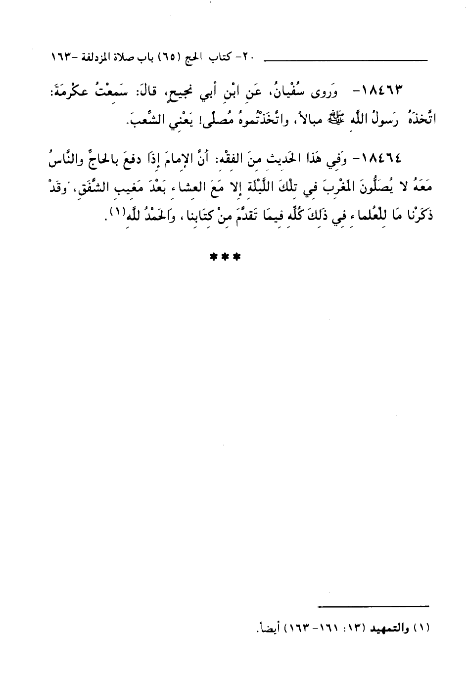 18464 - وَفِي هَذَا الْحَدِيثِ مِنَ الْفِقْهِ: أَنَّ الْإِمَامَ إِذَا دَفَعَ بِالْحَاجِّ وَالنَّاسُ مَعَهُ لَا يُصَلُّونَ الْمَغْرِبَ فِي تِلْكَ اللَّيْلَةِ إِلَّا مَعَ الْعِشَاءِ بَعْدَ مَغِيبِ الشَّفَقِ، وَقَدْ ذَكَرْنَا مَا لِلْعُلَمَاءِ فِي ذَلِكَ كُلِّهِ فِيمَا تَقَدَّمَ مِنْ كِتَابِنَا، وَالْحَمْدُ لِلَّهِ.