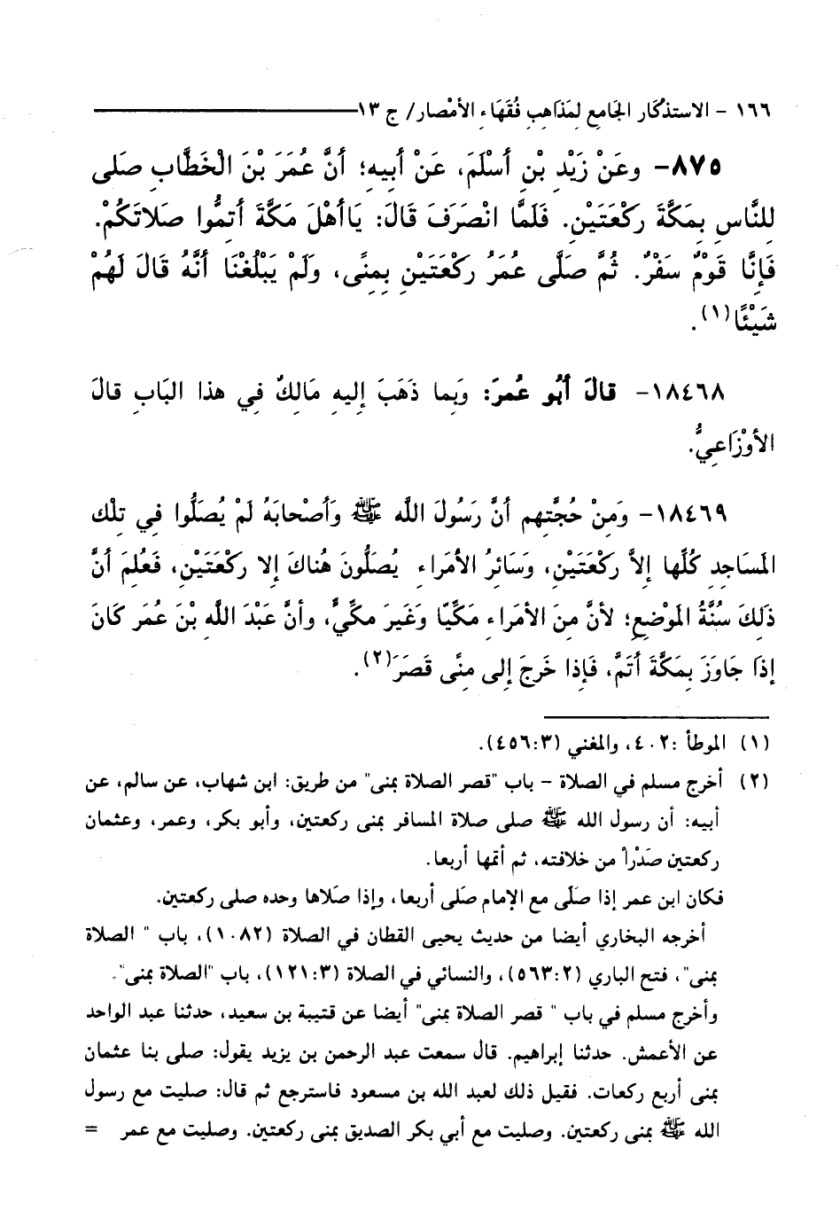 875 - وَعَنْ زَيْدِ بْنِ أَسْلَمَ، عَنْ أَبِيهِ أَنَّ عُمَرَ بْنَ الْخَطَّابِ صَلَّى لِلنَّاسِ بِمَكَّةَ رَكْعَتَيْنِ. فَلَمَّا انْصَرَفَ قَالَ: يَا أَهْلَ مَكَّةَ أَتِمُّوا صَلَاتَكُمْ فَإِنَّا قَوْمٌ سَفْرٌ. ثُمَّ صَلَّى عُمَرُ رَكْعَتَيْنِ بِمِنًى، وَلَمْ يَبْلُغْنَا أَنَّهُ قَالَ لَهُمْ شَيْئًا.