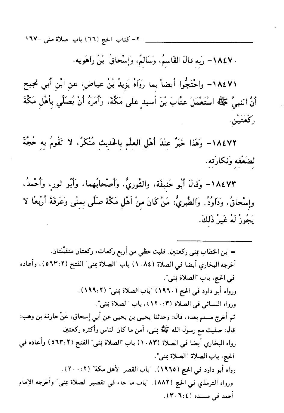18473 - وَقَالَ أَبُو حَنِيفَةَ، وَالثَّوْرِيُّ، وَأَصْحَابُهُمَا، وَأَبُو ثَوْرٍ، وَأَحْمَدُ، وَإِسْحَاقُ، وَدَاوُدُ، وَالطَّبَرِيُّ: مَنْ كَانَ مِنْ أَهْلِ مَكَّةَ صَلَّى بِمِنًى وَعَرَفَةَ أَرْبَعًا لَا يَجُوزُ لَهُ غَيْرُ ذَلِكَ.