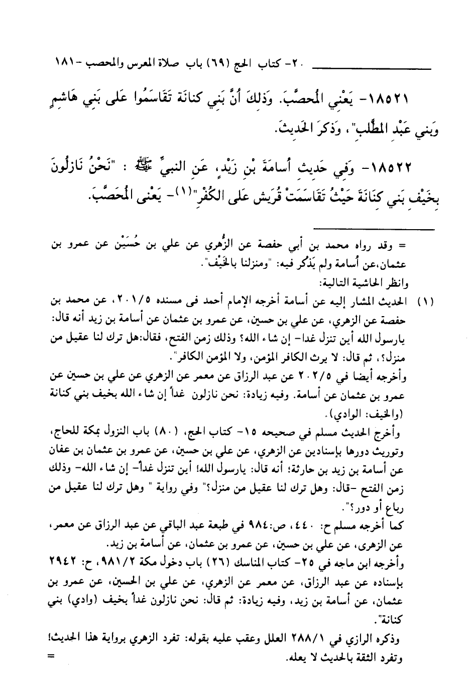 18521 - يَعْنِي الْمُحَصَّبَ. وَذَلِكَ أَنَّ بَنِي كِنَانَةَ تَقَاسَمُوا عَلَى بَنِي هَاشِمٍ وَبَنِي عَبْدِ الْمُطَّلِبِ، وَذَكَرَ الْحَدِيثَ.