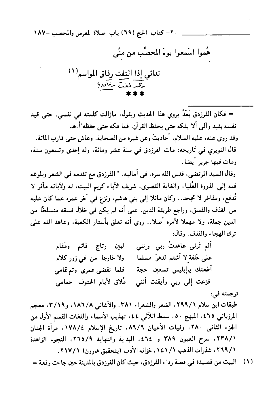 هُمُوا اسْمَعُوا يَوْمَ الْمُحَصَّبِ مِنْ مِنًى نِدَائِي إِذَا الْتَفَّتْ رِفَاقُ الْمَوَاسِمِ