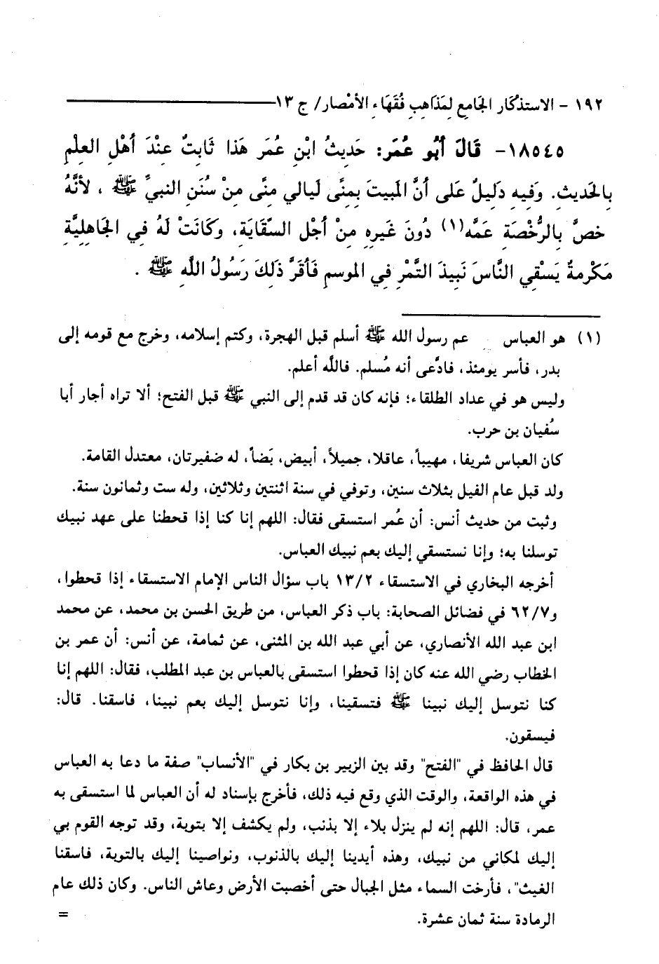 18545 - قَالَ أَبُو عُمَرَ: حَدِيثُ ابْنِ عُمَرَ هَذَا ثَابِتٌ عِنْدَ أَهْلِ الْعِلْمِ بِالْحَدِيثِ. وَفِيهِ دَلِيلٌ عَلَى أَنَّ الْمَبِيتَ بِمِنًى لَيَالِيَ مِنًى مِنْ سُنَنِ النَّبِيِّ - صَلَّى اللَّهُ عَلَيْهِ وَسَلَّمَ - لِأَنَّهُ خَصَّ بِالرُّخْصَةِ عَمَّهُ دُونَ غَيْرِهِ مِنْ أَجْلِ السِّقَايَةِ، وَكَانَتْ لَهُ فِي الْجَاهِلِيَّةِ مَكْرُمَةً يَسْقِي النَّاسَ نَبِيذَ التَّمْرِ فِي الْمَوْسِمِ فَأَقَرَّ ذَلِكَ رَسُولُ اللَّهِ - صَلَّى اللَّهُ عَلَيْهِ وَسَلَّمَ -.