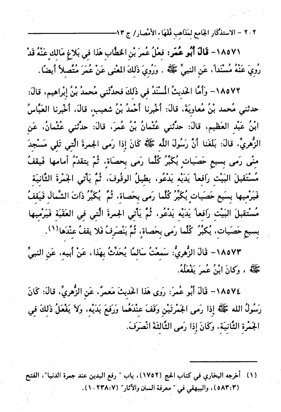 18574 - قَالَ أَبُو عُمَرَ: رَوَى هَذَا الْحَدِيثَ مَعْمَرٌ، عَنِ الزُّهْرِيِّ قَالَ: كَانَ رَسُولُ اللَّهِ - صَلَّى اللَّهُ عَلَيْهِ وَسَلَّمَ - إِذَا رَمَى الْجَمْرَتَيْنِ وَقَفَ عِنْدَهُمَا وَرَفَعَ يَدَيْهِ، وَلَا يَفْعَلُ ذَلِكَ فِي الْجَمْرَةِ الثَّانِيَةِ، وَكَانَ إِذَا رَمَى الثَّالِثَةَ انْصَرَفَ.