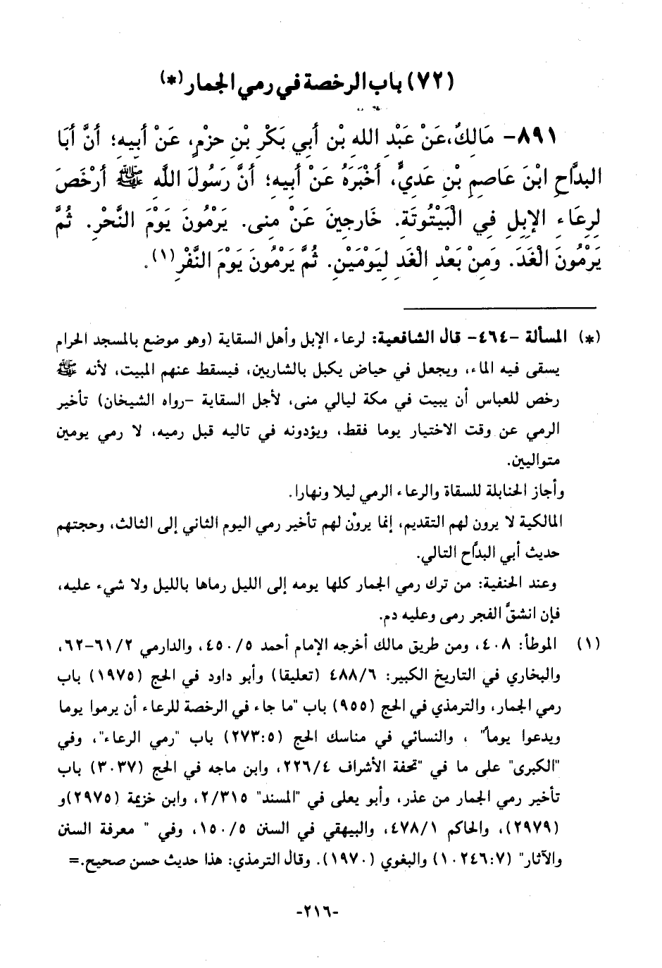 891 - مَالِكٌ، عَنْ عَبْدِ اللَّهِ بْنِ أَبِي بَكْرِ بْنِ حَزْمٍ، عَنْ أَبِيهِ أَنَّ أَبَا الْبَدَّاحِ بْنَ عَاصِمِ بْنِ عَدِيٍّ، أَخْبَرَهُ عَنْ أَبِيهِ أَنَّ رَسُولَ اللَّهِ - صَلَّى اللَّهُ عَلَيْهِ وَسَلَّمَ - أَرْخَصَ لِرِعَاءِ الْإِبِلِ فِي الْبَيْتُوتَةِ، خَارِجِينَ عَنْ مِنًى، يَرْمُونَ يَوْمَ النَّحْرِ، ثُمَّ يَرْمُونَ الْغَدَ، وَمِنْ بَعْدِ الْغَدِ لِيَوْمَيْنِ، ثُمَّ يَرْمُونَ يَوْمَ النَّفْرِ.