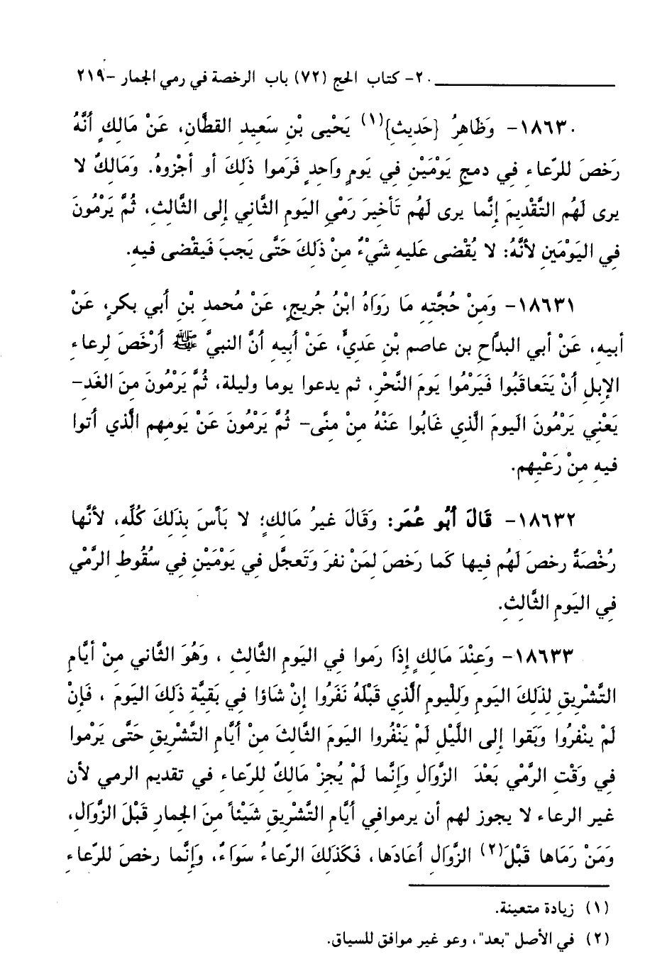 18630 - وَظَاهِرُ حَدِيثِ يَحْيَى بْنِ سَعِيدٍ الْقَطَّانِ، عَنْ مَالِكٍ أَنَّهُ رَخَّصَ لِلرِّعَاءِ فِي دَمْجِ يَوْمَيْنِ فِي يَوْمٍ وَاحِدٍ فَرَمَوْا ذَلِكَ أَوْ أَجْزُوهُ. وَمَالِكٌ لَا يَرَى لَهُمُ التَّقْدِيمَ إِنَّمَا يَرَى لَهُمْ تَأْخِيرَ رَمْيِ الْيَوْمِ الثَّانِي إِلَى الثَّالِثِ، ثُمَّ يَرْمُونَ فِي الْيَوْمَيْنِ لِأَنَّهُ لَا يُقْضَى عَلَيْهِ شَيْءٌ مِنْ ذَلِكَ حَتَّى يَجِبَ فَيُقْضَى فِيهِ.