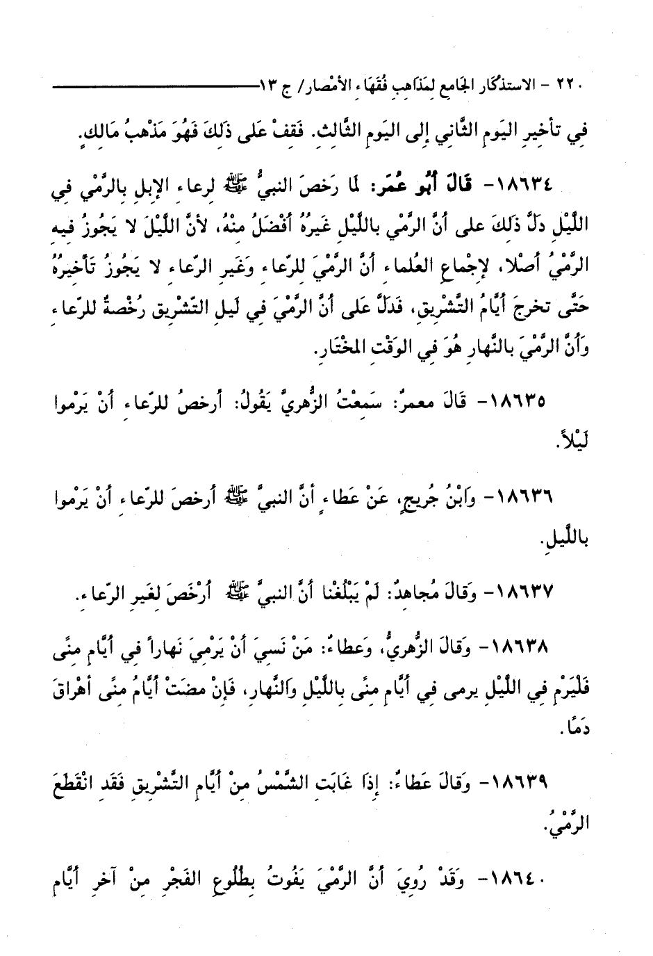 18634 - قَالَ أَبُو عُمَرَ: لَمَّا رَخَّصَ النَّبِيُّ - صَلَّى اللَّهُ عَلَيْهِ وَسَلَّمَ - لِرِعَاءِ الْإِبِلِ بِالرَّمْي فِي اللَّيْلِ دَلَّ ذَلِكَ عَلَى أَنَّ الرَّمْيَ بِاللَّيْلِ غَيْرُهُ أَفْضَلُ مِنْهُ ؛ لِأَنَّ اللَّيْلَ لَا يَجُوزُ فِيهِ الرَّمْيُ أَصْلًا ؛ لِإِجْمَاعِ الْعُلَمَاءِ أَنَّ الرَّمْيَ لِلرِّعَاءِ وَغَيْرِ الرِّعَاءِ لَا يَجُوزُ تَأْخِيرُهُ حَتَّى تَخْرُجَ أَيَّامُ التَّشْرِيقِ، فَدَلَّ عَلَى أَنَّ الرَّمْيَ فِي لَيْلِ التَّشْرِيقِ رُخْصَةٌ لِلرِّعَاءِ، وَأَنَّ الرَّمْيَ بِالنَّهَارِ هُوَ فِي الْوَقْتِ الْمُخْتَارِ.