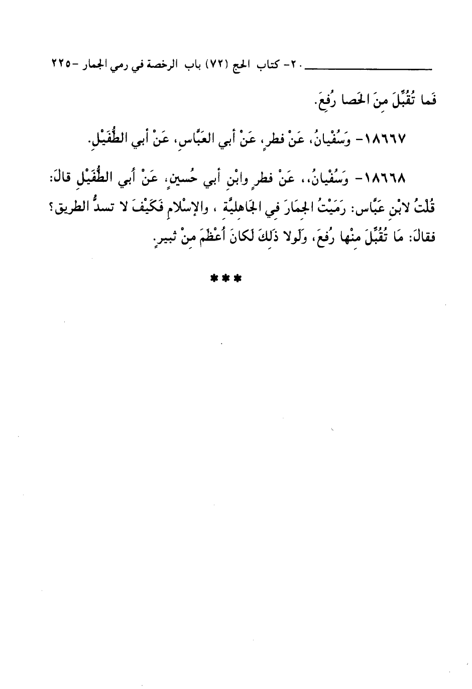 18668 - وَسُفْيَانُ، عَنْ فِطْرٍ وَابْنِ أَبِي حُسَيْنٍ، عَنْ أَبِي الطُّفَيْلِ قَالَ: قُلْتُ لِابْنِ عَبَّاسٍ: رَمَيْتُ الْجِمَارَ فِي الْجَاهِلِيَّةِ وَالْإِسْلَامِ فَكَيْفَ لَا تَسُدُّ الطَّرِيقَ ؟ فَقَالَ: مَا تُقُبِّلَ مِنْهَا رُفِعَ، وَلَوْلَا ذَلِكَ لَكَانَ أَعْظَمَ مِنْ ثَبِيرٍ.