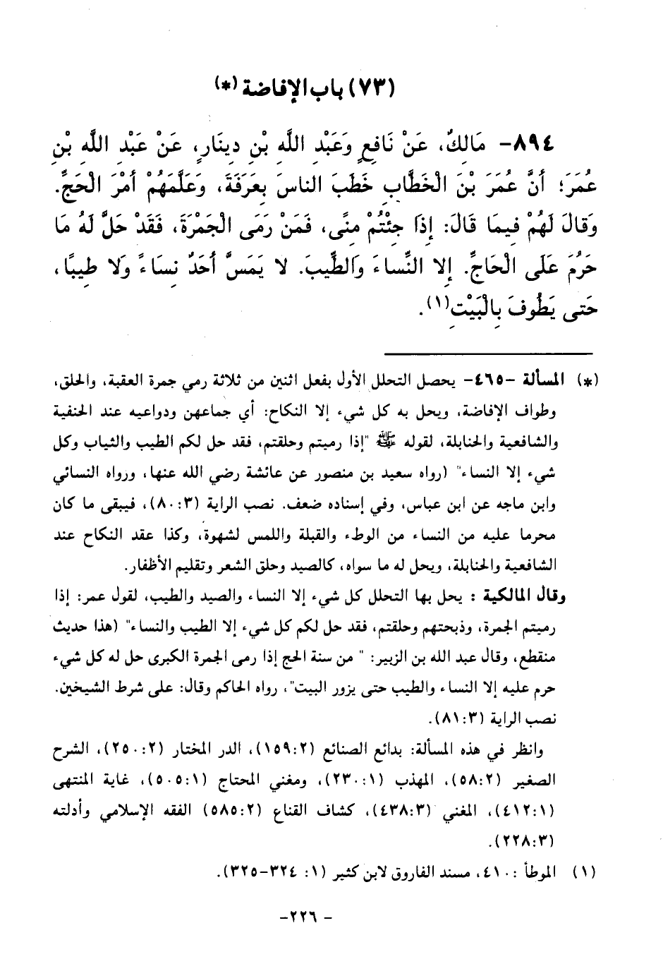 894 - مَالِكٌ، عَنْ نَافِعٍ وَعَبْدِ اللَّهِ بْنِ دِينَارٍ، عَنْ عَبْدِ اللَّهِ بْنِ عُمَرَ أَنَّ عُمَرَ بْنَ الْخَطَّابِ خَطَبَ النَّاسَ بِعَرَفَةَ، وَعَلَّمَهُمْ أَمْرَ الْحَجِّ. وَقَالَ لَهُمْ فِيمَا قَالَ: إِذَا جِئْتُمْ مِنًى، فَمَنْ رَمَى الْجَمْرَةَ فَقَدْ حَلَّ لَهُ مَا حَرُمَ عَلَى الْحَاجِّ، إِلَّا النِّسَاءَ وَالطِّيبَ، لَا يَمَسَّ أَحَدٌ نِسَاءً وَلَا طِيبًا، حَتَّى يَطُوفَ بِالْبَيْتِ.