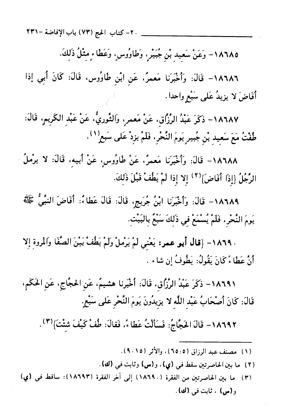 18689 - قَالَ: وَأَخْبَرَنَا ابْنُ جُرَيْجٍ قَالَ: قَالَ عَطَاءٌ: أَفَاضَ النَّبِيُّ - صَلَّى اللَّهُ عَلَيْهِ وَسَلَّمَ - يَوْمَ النَّحْرِ، فَلَمْ يُسْمَعْ فِي ذَلِكَ: سَبْعٌ بِالْبَيْتِ.