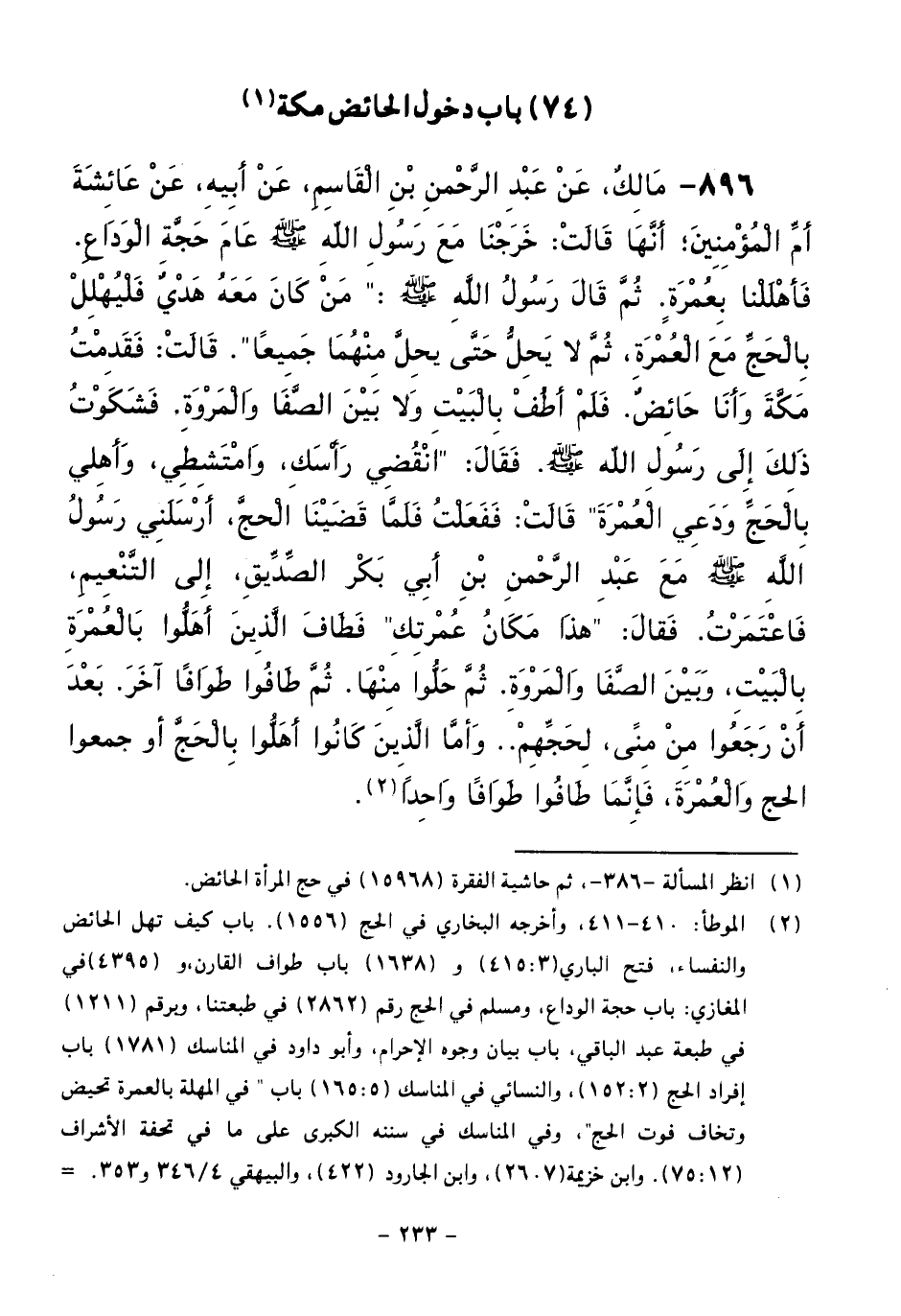 896 - مَالِكٌ، عَنْ عَبْدِ الرَّحْمَنِ بْنِ الْقَاسِمِ، عَنْ أَبِيهِ، عَنْ عَائِشَةَ أُمِّ الْمُؤْمِنِينَ أَنَّهَا قَالَتْ: خَرَجْنَا مَعَ رَسُولِ اللَّهِ - صَلَّى اللَّهُ عَلَيْهِ وَسَلَّمَ - عَامَ حَجَّةِ الْوَدَاعِ. فَأَهْلَلْنَا بِعُمْرَةٍ. ثُمَّ قَالَ رَسُولُ اللَّهِ - صَلَّى اللَّهُ عَلَيْهِ وَسَلَّمَ -: " مَنْ كَانَ مَعَهُ هَدْيٌ فَلْيُهْلِلْ بِالْحَجِّ مَعَ الْعُمْرَةِ، ثُمَّ لَا يَحِلَّ حَتَّى يَحِلَّ مِنْهُمَا جَمِيعًا ". قَالَتْ: فَقَدِمْتُ مَكَّةَ وَأَنَا حَائِضٌ. فَلَمْ أَطُفْ بِالْبَيْتِ وَلَا بَيْنَ الصَّفَا وَالْمَرْوَةِ. فَشَكَوْتُ ذَلِكَ إِلَى رَسُولِ اللَّهِ - صَلَّى اللَّهُ عَلَيْهِ وَسَلَّمَ -. فَقَالَ: " انْقُضِي رَأْسَكِ، وَامْتَشِطِي، وَأَهِلِّي بِالْحَجِّ وَدَعِي الْعُمْرَةَ " قَالَتْ: فَفَعَلْتُ فَلَمَّا قَضَيْنَا الْحَجَّ، أَرْسَلَنِي رَسُولُ اللَّهِ - صَلَّى اللَّهُ عَلَيْهِ وَسَلَّمَ - مَعَ عَبْدِ الرَّحْمَنِ بْنِ أَبِي بَكْرٍ الصِّدِّيقِ، إِلَى التَّنْعِيمِ، فَاعْتَمَرْتُ. فَقَالَ: " هَذَا مَكَانُ عُمْرَتِكِ ". فَطَافَ الَّذِينَ أَهَلُّوا بِالْعُمْرَةِ بِالْبَيْتِ، وَبَيْنَ الصَّفَا وَالْمَرْوَةِ، ثُمَّ حَلُّوا مِنْهَا، ثُمَّ طَافُوا طَوَافًا آخَرَ بَعْدَ أَنْ رَجَعُوا مِنْ مِنًى، لِحَجِّهِمْ.. وَأَمَّا الَّذِينَ كَانُوا أَهَلُّوا بِالْحَجِّ أَوْ جَمَعُوا الْحَجَّ وَالْعُمْرَةَ، فَإِنَّمَا طَافُوا طَوَافًا وَاحِدًا.