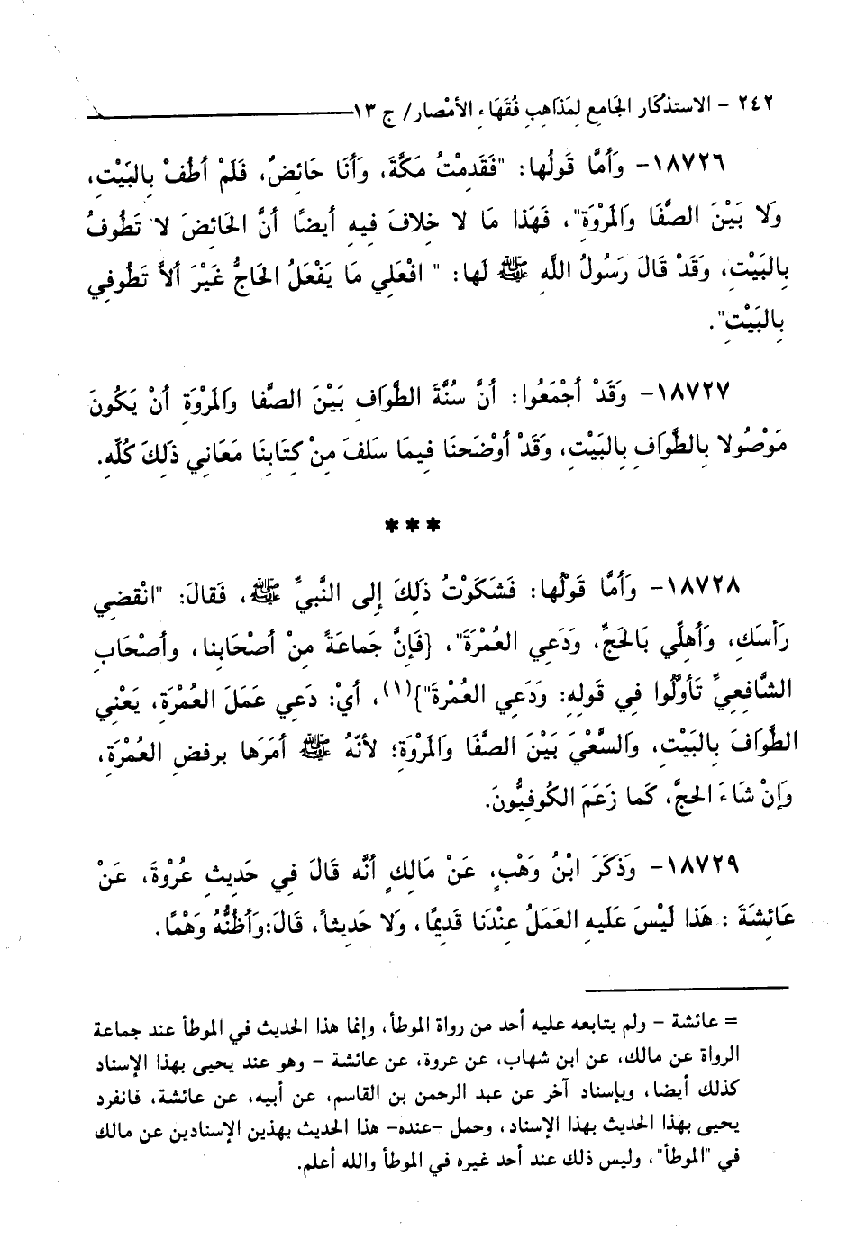 18726 - وَأَمَّا قَوْلُهَا: " فَقَدِمْتُ مَكَّةَ، وَأَنَا حَائِضٌ، فَلَمْ أَطُفْ بِالْبَيْتِ، وَلَا بَيْنَ الصَّفَا وَالْمَرْوَةِ " فَهَذَا مَا لَا خِلَافَ فِيهِ أَيْضًا أَنَّ الْحَائِضَ لَا تَطُوفُ بِالْبَيْتِ، وَقَدْ قَالَ رَسُولُ اللَّهِ - صَلَّى اللَّهُ عَلَيْهِ وَسَلَّمَ - لَهَا: " افْعَلِي مَا يَفْعَلُ الْحَاجُّ غَيْرَ أَلَّا تَطُوفِي بِالْبَيْتِ ".