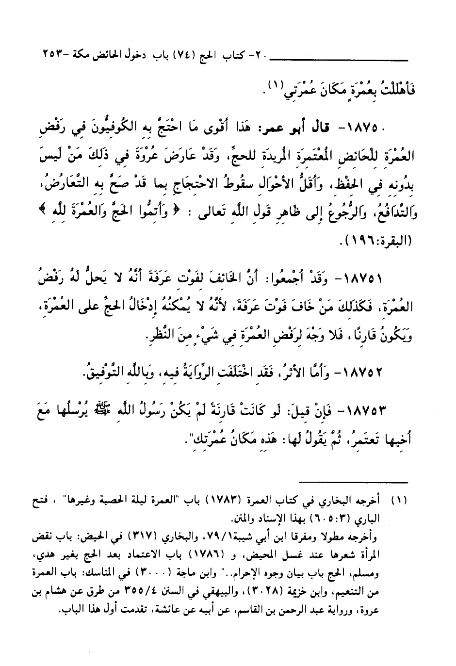 18750 - قَالَ أَبُو عُمَرَ: هَذَا أَقْوَى مَا احْتَجَّ بِهِ الْكُوفِيُّونَ فِي رَفْضِ الْعُمْرَةِ لِلْحَائِضِ الْمُعْتَمِرَةِ الْمُرِيدَةِ لِلْحَجِّ، وَقَدْ عَارَضَ عُرْوَةَ فِي ذَلِكَ مَنْ لَيْسَ بِدُونِهِ فِي الْحِفْظِ، وَأَقَلُّ الْأَحْوَالِ سُقُوطُ الِاحْتِجَاجِ بِمَا قَدْ صَحَّ بِهِ التَّعَارُضُ، وَالتَّدَافُعُ، وَالرُّجُوعُ إِلَى ظَاهِرِ قَوْلِ اللَّهِ - تَعَالَى -: وَأَتِمُّوا الْحَجَّ وَالْعُمْرَةَ لِلَّهِ ( الْبَقَرَةِ: 196 ).