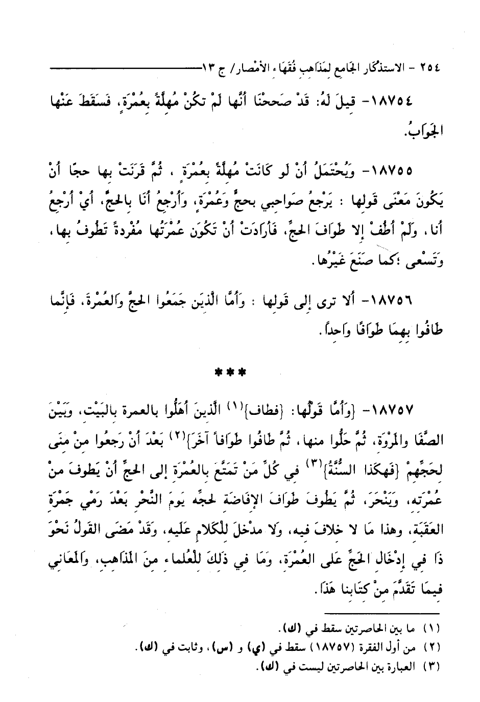 18755 - وَيُحْتَمَلُ أَنْ لَوْ كَانَتْ مُهِلَّةً بِعُمْرَةٍ ثُمَّ قَرَنَتْ بِهَا حَجًّا أَنْ يَكُونَ مَعْنَى قَوْلِهَا: يَرْجِعُ صَوَاحِبِي بِحَجٍّ وَعُمْرَةٍ، وَأَرْجِعُ أَنَا بِالْحَجِّ، أَيْ أَرْجِعُ أَنَا، وَلَمْ أَطُفْ إِلَّا طَوَافَ الْحَجِّ، فَأَرَادَتْ أَنْ تَكُونَ عُمْرَتُهَا مُفْرَدَةً تَطُوفُ بِهَا، وَتَسْعَى كَمَا صَنَعَ غَيْرُهَا.