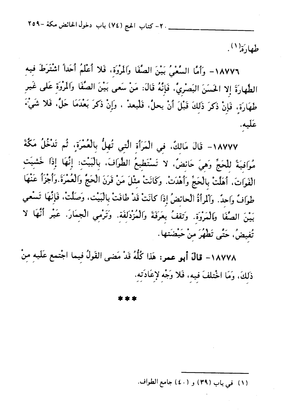 18777 - قَالَ مَالِكٌ فِي الْمَرْأَةِ الَّتِي تُهِلُّ بِالْعُمْرَةِ، ثُمَّ تَدْخُلُ مَكَّةَ مُوَافِيَةً لِلْحَجِّ وَهِيَ حَائِضٌ، لَا تَسْتَطِيعُ الطَّوَافَ بِالْبَيْتِ: إِنَّهَا إِذَا خَشِيَتِ الْفَوَاتَ أَهَلَّتْ بِالْحَجِّ وَأَهْدَتْ. وَكَانَتْ مِثْلَ مَنْ قَرَنَ الْحَجَّ وَالْعُمْرَةَ. وَأَجْزَأَ عَنْهَا طَوَافٌ وَاحِدٌ. وَالْمَرْأَةُ الْحَائِضُ إِذَا كَانَتْ قَدْ طَافَتْ بِالْبَيْتِ وَصَلَتْ، فَإِنَّهَا تَسْعَى بَيْنَ الصَّفَا وَالْمَرْوَةِ. وَتَقِفُ بِعَرَفَةَ وَالْمُزْدَلِفَةِ وَتَرْمِي الْجِمَارَ. غَيْرَ أَنَّهَا لَا تُفِيضُ، حَتَّى تَطْهُرَ مِنْ حَيْضَتِهَا.