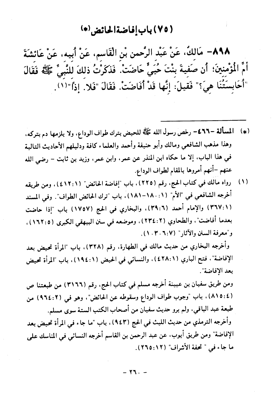 898 - مَالِكٌ، عَنْ عَبْدِ الرَّحْمَنِ بْنِ الْقَاسِمِ، عَنْ أَبِيهِ، عَنْ عَائِشَةَ أُمِّ الْمُؤْمِنِينَ أَنَّ صَفِيَّةَ بِنْتَ حُيَيٍّ حَاضَتْ. فَذَكَرَتْ ذَلِكَ لِلنَّبِيِّ - صَلَّى اللَّهُ عَلَيْهِ وَسَلَّمَ - فَقَالَ " أَحَابِسَتُنَا هِيَ ؟ " فَقِيلَ: إِنَّهَا قَدْ أَفَاضَتْ. فَقَالَ " فَلَا إِذًا ".