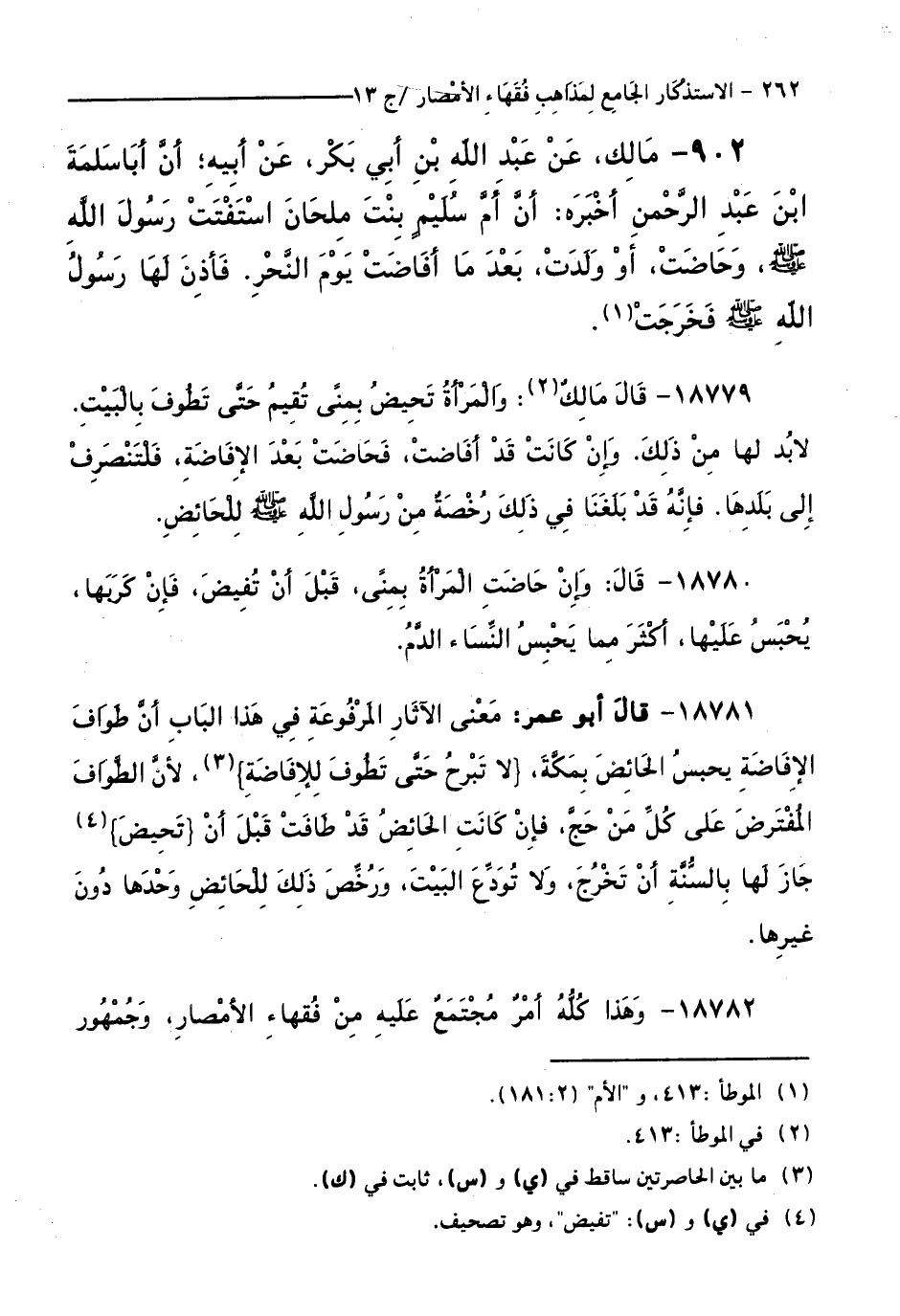 18779 - قَالَ مَالِكٌ: وَالْمَرْأَةُ تَحِيضُ بِمِنًى تُقِيمُ حَتَّى تَطُوفَ بِالْبَيْتِ، لَابُدَّ لَهَا مِنْ ذَلِكَ. وَإِنْ كَانَتْ قَدْ أَفَاضَتْ، فَحَاضَتْ بَعْدَ الْإِفَاضَةِ، فَلْتَنْصَرِفْ إِلَى بَلَدِهَا. فَإِنَّهُ قَدْ بَلَغَنَا فِي ذَلِكَ رُخْصَةٌ مِنْ رَسُولِ اللَّهِ - صَلَّى اللَّهُ عَلَيْهِ وَسَلَّمَ - لِلْحَائِضِ.