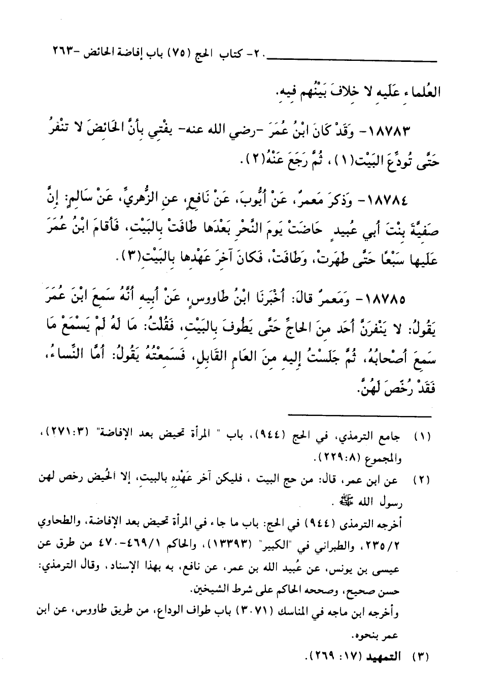 18783 - وَقَدْ كَانَ ابْنُ عُمَرَ - رَضِيَ اللَّهُ عَنْهُ - يُفْتِي بِأَنَّ الْحَائِضَ لَا تَنْفِرُ حَتَّى تُوَدِّعَ الْبَيْتَ ثُمَّ رَجَعَ عَنْهُ.