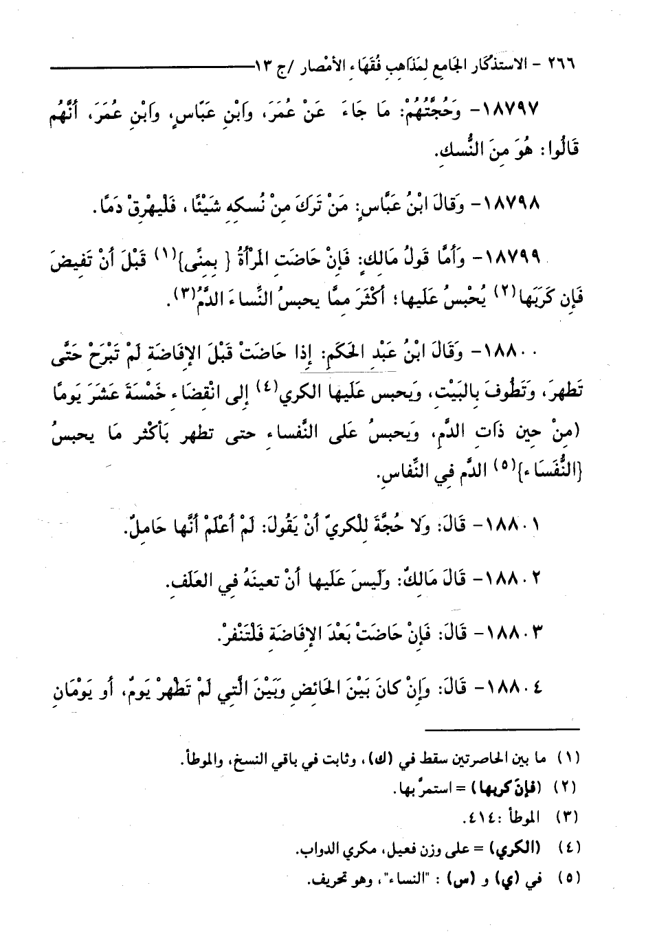 18799 - وَأَمَّا قَوْلُ مَالِكٍ: فَإِنْ حَاضَتِ الْمَرْأَةُ بِمِنًى قَبْلَ أَنْ تُفِيضَ فَإِنَّ كَرْبَهَا يَحْبِسُ عَلَيْهَا أَكْثَرَ مِمَّا يَحْبِسُ النِّسَاءَ الدَّمُ.