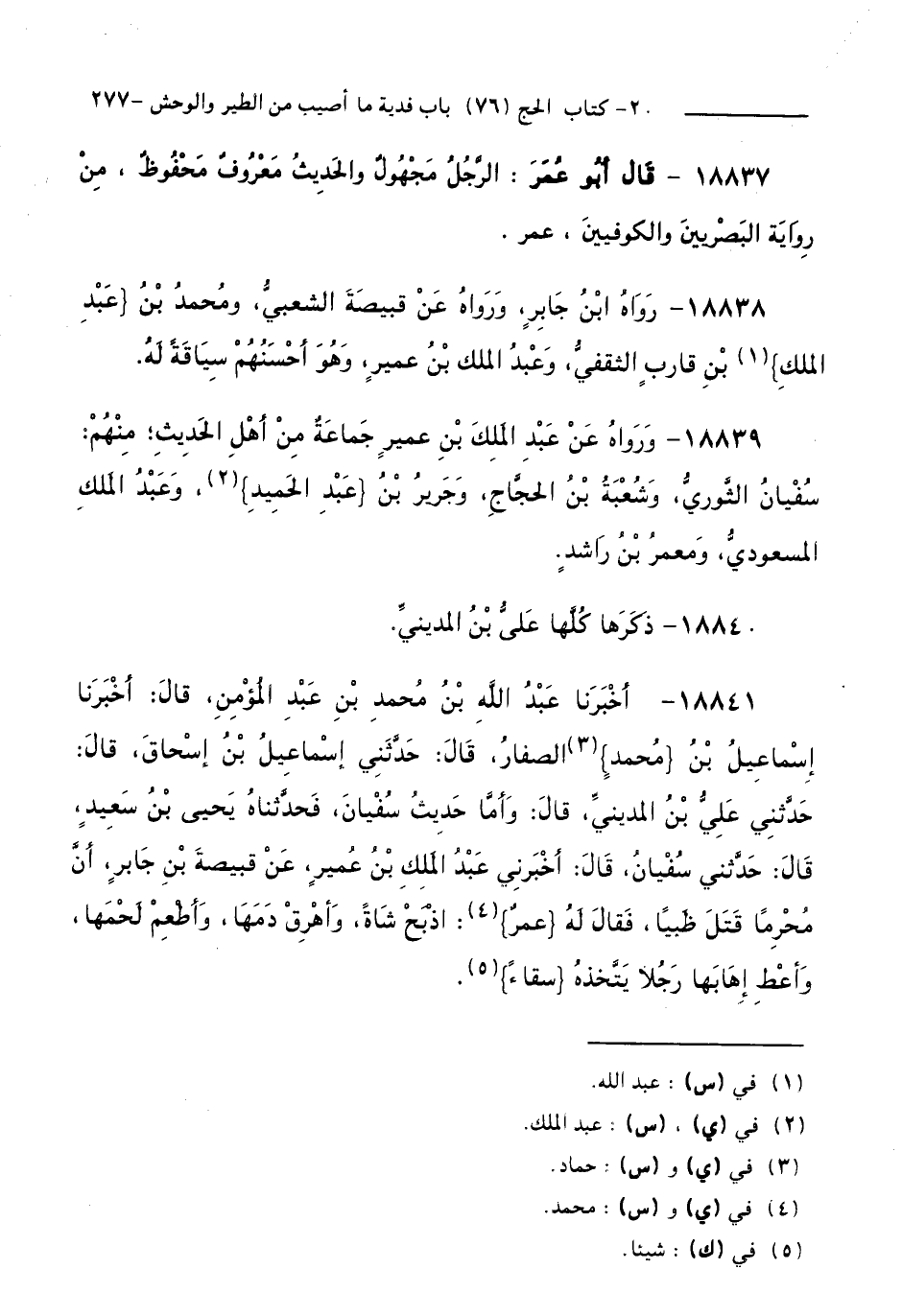 18841 - أَخْبَرَنَا عَبْدُ اللَّهِ بْنُ مُحَمَّدِ بْنِ عَبْدِ الْمُؤْمِنِ قَالَ: أَخْبَرَنَا إِسْمَاعِيلُ بْنُ مُحَمَّدٍ الصَّفَّارُ قَالَ: حَدَّثَنِي إِسْمَاعِيلُ بْنُ إِسْحَاقَ قَالَ: حَدَّثَنِي عَلِيُّ بْنُ الْمَدِينِيِّ قَالَ: وَأَمَّا حَدِيثُ سُفْيَانَ، فَحَدَّثْنَاهُ يَحْيَى بْنُ سَعِيدٍ قَالَ: حَدَّثَنِي سُفْيَانُ قَالَ: أَخْبَرَنِي عَبْدُ الْمَلِكِ بْنُ عُمَيْرٍ، عَنْ قَبِيصَةَ بْنِ جَابِرٍ، أَنَّ مُحْرِمًا قَتَلَ ظَبْيًا، فَقَالَ لَهُ عُمَرُ: اذْبَحْ شَاةً، وَأَهْرِقْ دَمَهَا، وَأَطْعِمْ لَحْمَهَا، وَأَعْطِ إِهَابَهَا رَجُلًا يَتَّخِذُهُ سِقَاءً.