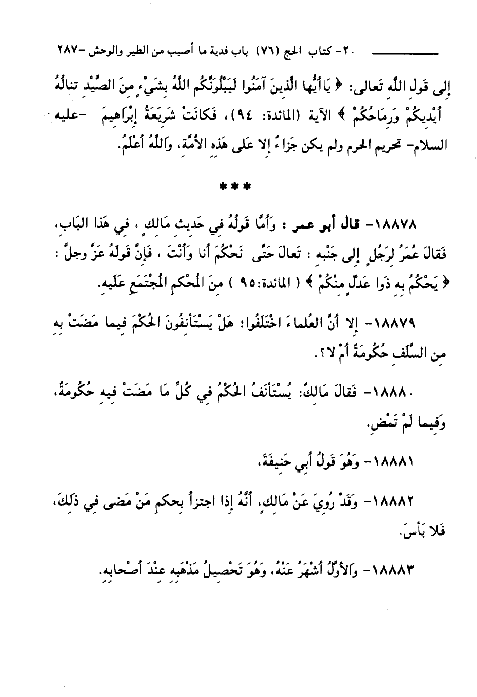 18878 - قَالَ أَبُو عُمَرَ: وَأَمَّا قَوْلُهُ فِي حَدِيثِ مَالِكٍ فِي هَذَا الْبَابِ، فَقَالَ عُمَرُ لِرَجُلٍ إِلَى جَنْبِهِ، تَعَالَ حَتَّى نَحْكُمَ أَنَا وَأَنْتَ، فَإِنَّ قَوْلَهُ - عَزَّ وَجَلَّ - يَحْكُمُ بِهِ ذَوَا عَدْلٍ مِنْكُمْ [ الْمَائِدَةِ: 95 ] مِنَ الْمُحْكَمِ الْمُجْتَمَعِ عَلَيْهِ.