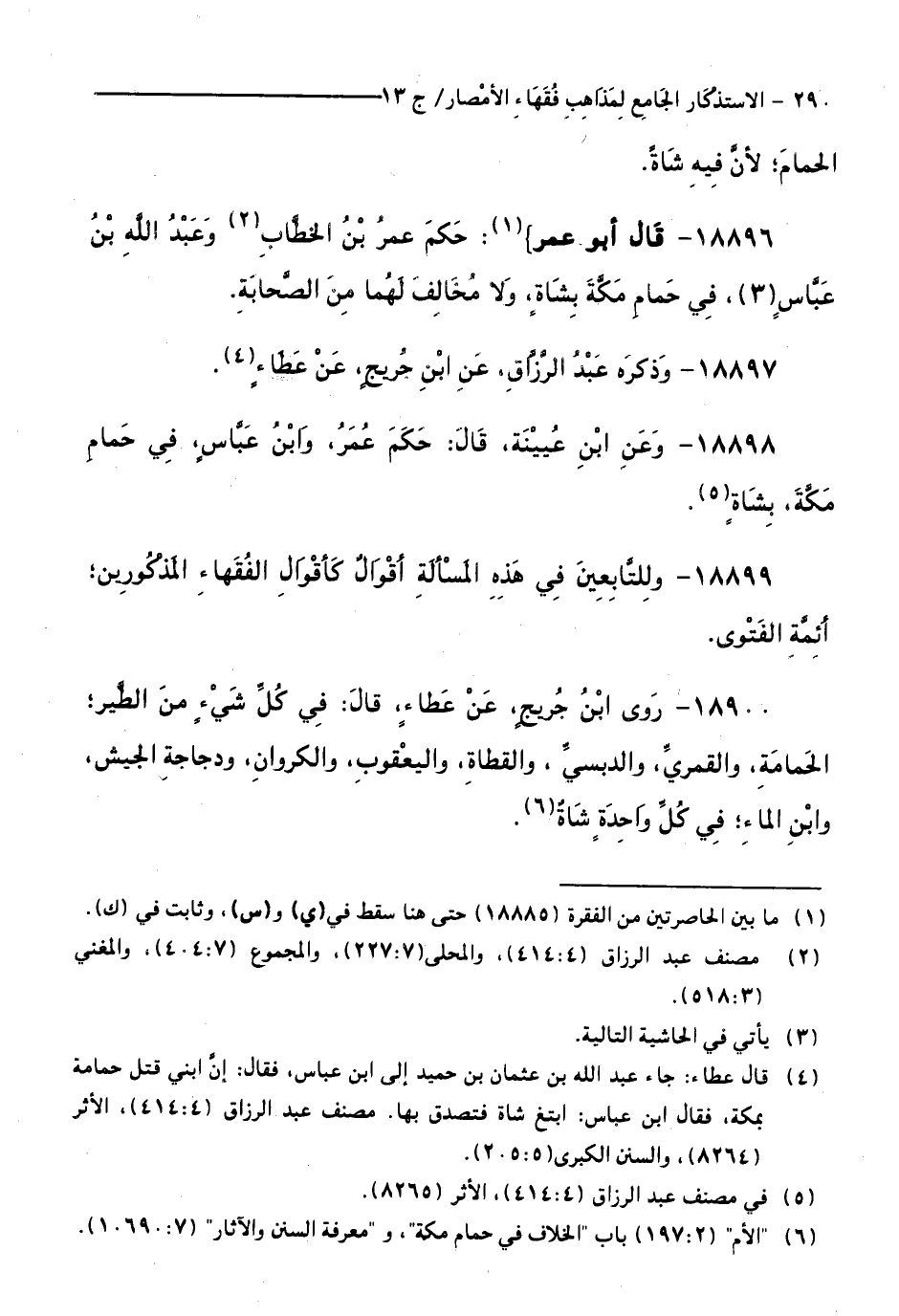 18900 - رَوَى ابْنُ جُرَيْجٍ، عَنْ عَطَاءٍ قَالَ: فِي كُلِّ شَيْءٍ مِنَ الطَّيْرِ الْحَمَامَةِ، وَالْقُمْرِيِّ، وَالدُّبْسِيِّ، وَالْقَطَاةِ، والْيَعْقُوبِ، وَالْكَرَوَانِ، وَدَجَاجَةِ الْجَيْشِ، وَابْنِ الْمَاءِ فِي كُلِّ وَاحِدَةٍ شَاةٌ.