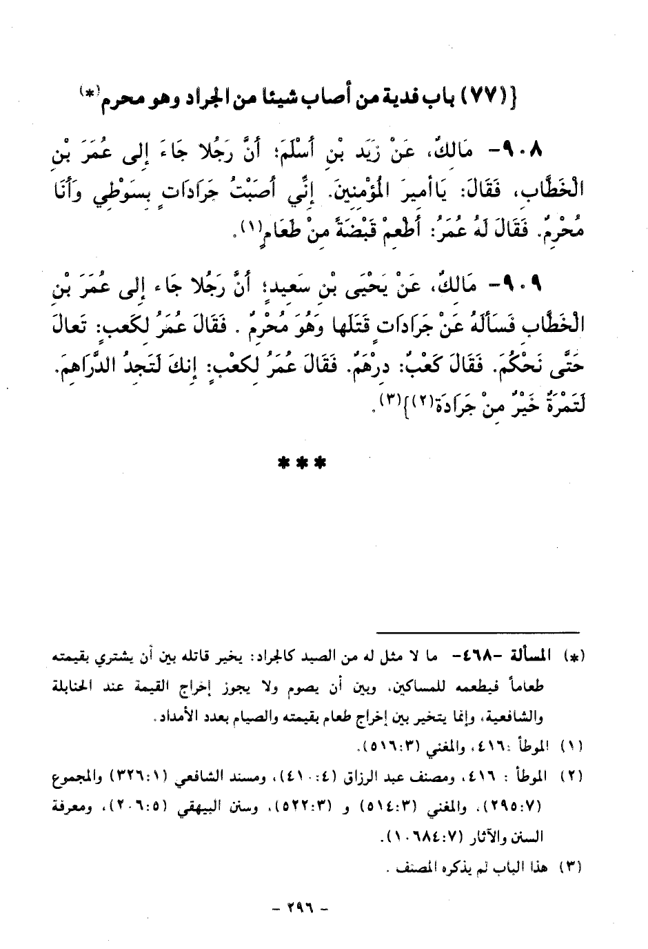 908 - مَالِكٌ، عَنْ زَيْدِ بْنِ أَسْلَمَ أَنَّ رَجُلًا جَاءَ إِلَى عُمَرَ بْنِ الْخَطَّابِ، فَقَالَ: يَا أَمِيرَ الْمُؤْمِنِينَ. إِنِّي أَصَبْتُ جَرَادَاتٍ بِسَوْطِي وَأَنَا مُحْرِمٌ، فَقَالَ لَهُ عُمَرُ: أَطْعِمْ قَبْضَةً مِنْ طَعَامٍ.