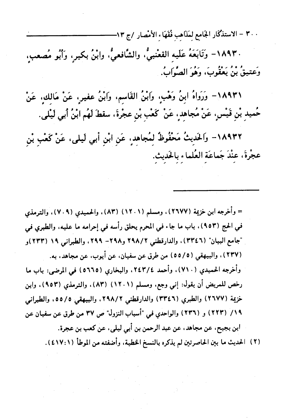 18931 - وَرَوَاهُ ابْنُ وَهْبٍ، وَابْنُ الْقَاسِمِ، وَابْنُ عُفَيْرٍ، عَنْ مَالِكٍ، عَنْ حُمَيْدِ بْنِ قَيْسٍ، عَنْ مُجَاهِدٍ، عَنْ كَعْبِ بْنِ عُجْرَةَ، سَقَطَ لَهُمُ ابْنُ أَبِي لَيْلَى.