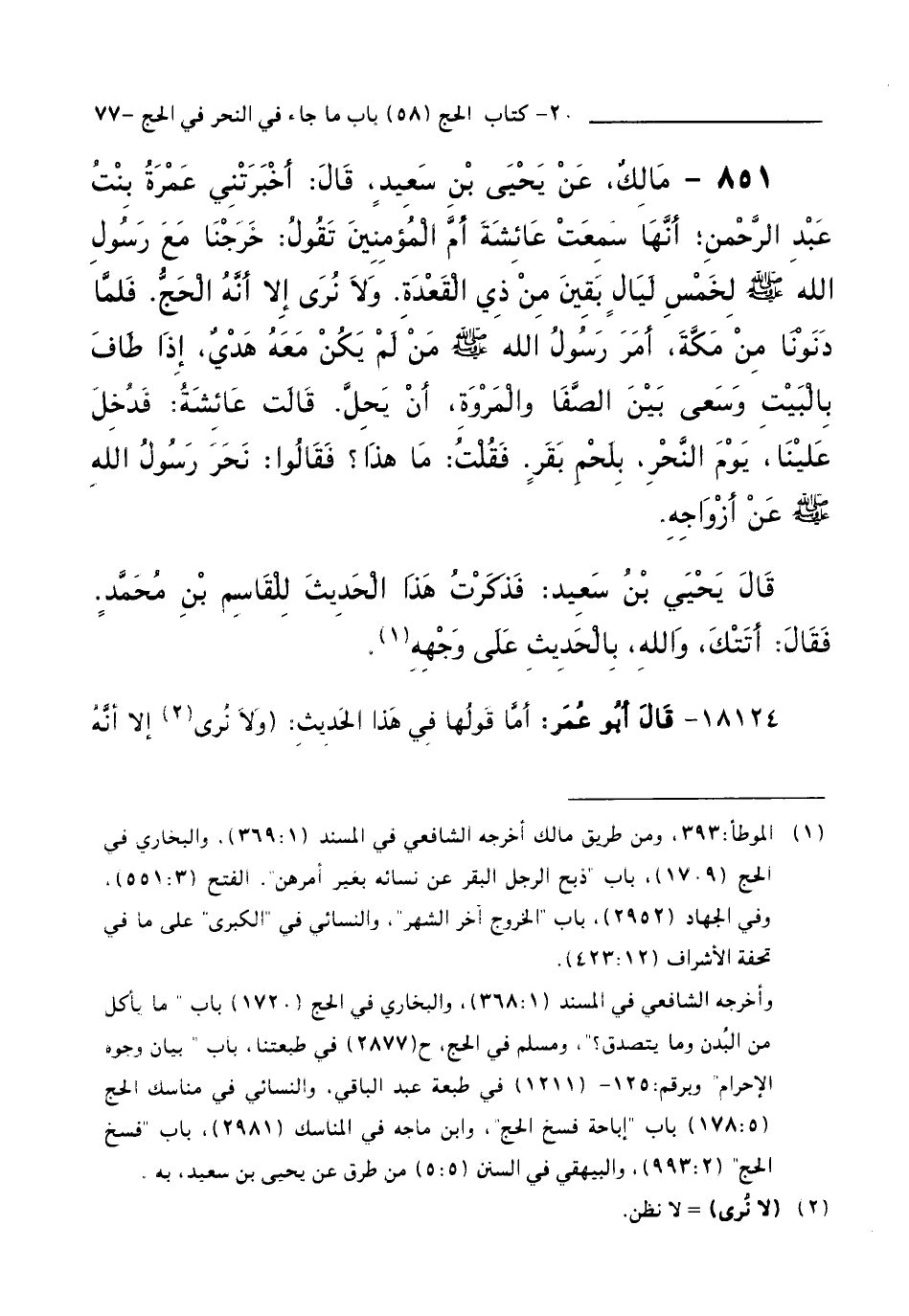 851 - مَالِكٌ، عَنْ يَحْيَى بْنِ سَعِيدٍ قَالَ: أَخْبَرَتْنِي عَمْرَةُ بِنْتُ عَبْدِ الرَّحْمَنِ أَنَّهَا سَمِعَتْ عَائِشَةَ أُمَّ الْمُؤْمِنِينَ تَقُولُ: خَرَجْنَا مَعَ رَسُولِ اللَّهِ - صَلَّى اللَّهُ عَلَيْهِ وَسَلَّمَ - لِخَمْسِ لَيَالٍ بَقِينَ مِنْ ذِي الْقَعْدَةِ، وَلَا نَرَى إِلَّا أَنَّهُ الْحَجُّ، فَلَمَّا دَنَوْنَا مِنْ مَكَّةَ، أَمَرَ رَسُولُ اللَّهِ - صَلَّى اللَّهُ عَلَيْهِ وَسَلَّمَ - مَنْ لَمْ يَكُنْ مَعَهُ هَدْيٌ، إِذَا طَافَ بِالْبَيْتِ وَسَعَى بَيْنَ الصَّفَا وَالْمَرْوَةِ، أَنْ يَحِلَّ. قَالَتْ عَائِشَةُ: فَدُخِلَ عَلَيْنَا يَوْمَ النَّحْرِ بِلَحْمِ بَقَرٍ. فَقُلْتُ: مَا هَذَا ؟ فَقَالُوا: نَحَرَ رَسُولُ اللَّهِ - صَلَّى اللَّهُ عَلَيْهِ وَسَلَّمَ - عَنْ أَزْوَاجِهِ.