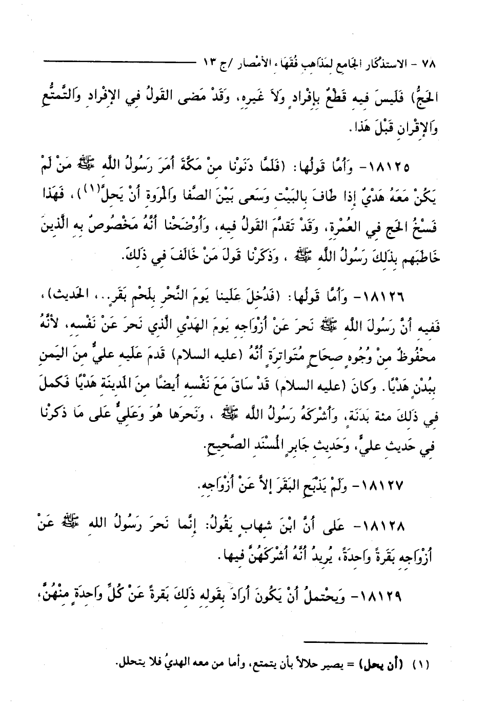 18128 - عَلَى أَنَّ ابْنَ شِهَابٍ يَقُولُ: إِنَّمَا نَحَرَ رَسُولُ اللَّهِ - صَلَّى اللَّهُ عَلَيْهِ وَسَلَّمَ - عَنْ أَزْوَاجِهِ بَقَرَةً وَاحِدَةً، يُرِيدُ أَنَّهُ أَشْرَكَهُنَّ فِيهَا.