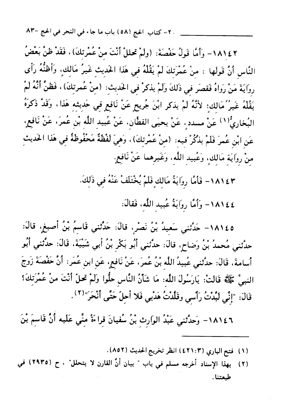 18144 - وَأَمَّا رِوَايَةُ عُبَيْدِ اللَّهِ، فَقَالَ: 18145 - حَدَّثَنِي سَعِيدُ بْنُ نَصْرٍ قَالَ: حَدَّثَنِي قَاسِمُ بْنُ أَصْبَغَ قَالَ: حَدَّثَنِي مُحَمَّدُ بْنُ وَضَّاحٍ قَالَ: حَدَّثَنِي أَبُو بَكْرِ بْنُ أَبِي شَيْبَةَ قَالَ: حَدَّثَنِي أَبُو أُسَامَةَ قَالَ: حَدَّثَنِي عُبَيْدُ اللَّهِ بْنُ عُمَرَ، عَنْ نَافِعٍ، عَنِ ابْنِ عُمَرَ: أَنَّ حَفْصَةَ زَوْجَ النَّبِيِّ - صَلَّى اللَّهُ عَلَيْهِ وَسَلَّمَ - قَالَتْ يَا رَسُولَ اللَّهِ - صَلَّى اللَّهُ عَلَيْهِ وَسَلَّمَ - مَا شَأْنُ النَّاسِ حَلُّوا وَلَمْ تَحِلَّ أَنْتَ مِنْ عُمْرَتِكَ ؟ قَالَ: " إِنِّي لَبَّدْتُ رَأْسِي وَقَلَّدْتُ هَدْيِي فَلَا أَحِلُّ حَتَّى أَنْحَرَ ".