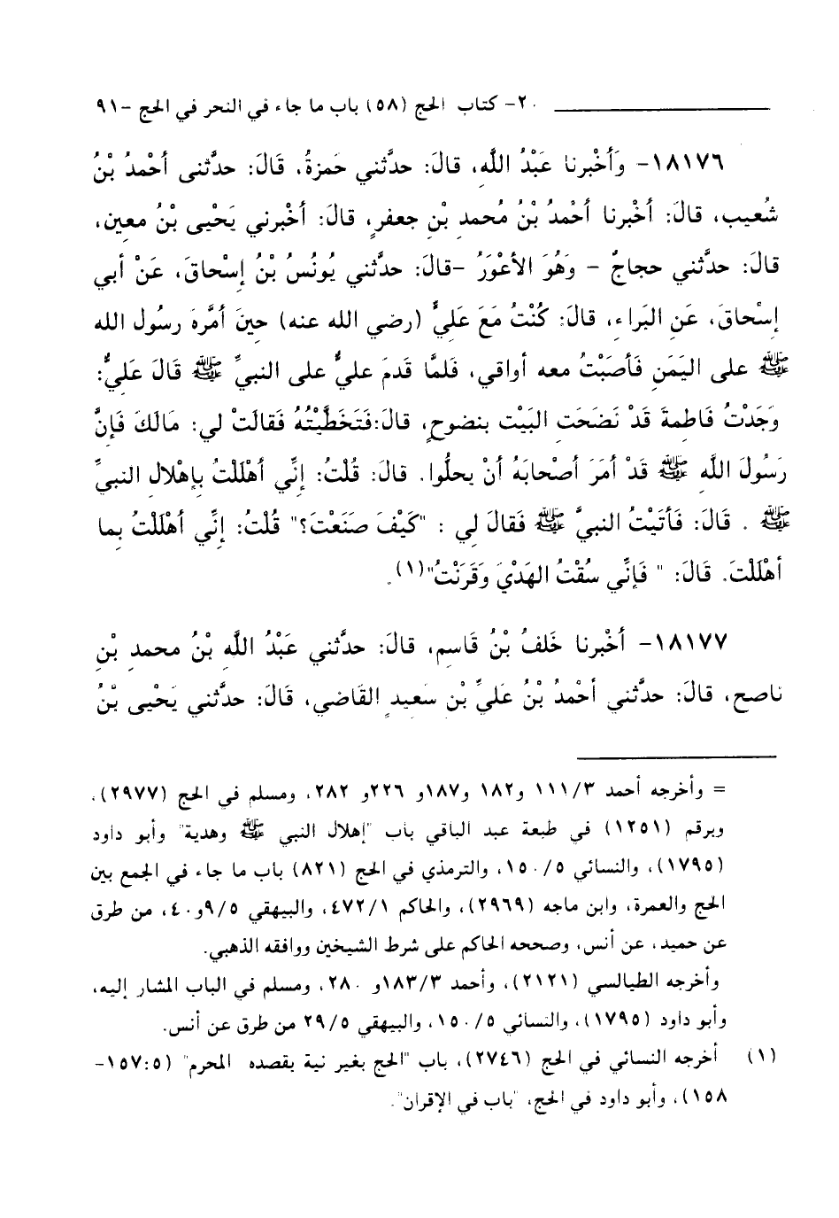 وَأَخْبَرَنَا عَبْدُ اللَّهِ قَالَ: حَدَّثَنِي حَمْزَةُ قَالَ: حَدَّثَنِي أَحْمَدُ بْنُ شُعَيْبٍ قَالَ: أَخْبَرَنَا أَحْمَدُ بْنُ مُحَمَّدِ بْنِ جَعْفَرٍ قَالَ: أَخْبَرَنِي يَحْيَى بْنُ مَعِينٍ قَالَ: حَدَّثَنِي حَجَّاجٌ - وَهُوَ الْأَعْوَرُ - قَالَ: حَدَّثَنِي يُونُسُ بْنُ إِسْحَاقَ، عَنْ أَبِي إِسْحَاقَ، عَنِ الْبَرَاءِ قَالَ: كُنْتُ مَعَ عَلِيٍّ ( رَضِيَ اللَّهُ عَنْهُ ) حِينَ أَمَّرَهُ رَسُولُ اللَّهِ - صَلَّى اللَّهُ عَلَيْهِ وَسَلَّمَ - عَلَى الْيَمَنِ فَأَصَبْتُ مَعَهُ أَوَاقِيَ، فَلَمَّا قَدِمَ عَلَى النَّبِيِّ - صَلَّى اللَّهُ عَلَيْهِ وَسَلَّمَ - قَالَ عَلِيٌّ: وَجَدْتُ فَاطِمَةَ قَدْ نَضَحَتِ الْبَيْتَ بِنَضُوحٍ قَالَ: فَتَخَطَّيْتُهُ فَقَالَتْ لِي: مَا لَكَ فَإِنَّ رَسُولَ اللَّهِ - صَلَّى اللَّهُ عَلَيْهِ وَسَلَّمَ - قَدْ أَمَرَ أَصْحَابَهُ أَنْ يَحِلُّوا قَالَ: قُلْتُ: إِنِّي أَهْلَلْتُ بِإِهْلَالِ النَّبِيِّ - صَلَّى اللَّهُ عَلَيْهِ وَسَلَّمَ قَالَ: فَأَتَيْتُ النَّبِيَّ - صَلَّى اللَّهُ عَلَيْهِ وَسَلَّمَ فَقَالَ لِي: " كَيْفَ صَنَعْتَ ؟ " قُلْتُ: إِنِّي أَهْلَلْتُ بِمَا أَهْلَلْتَ قَالَ: " فَإِنِّي سُقْتُ الْهَدْيَ وَقَرَنْتُ ".